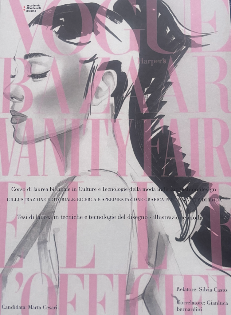 La neo-dottoressa Cesari ha incentrato il suo lavoro su “L’illustrazione editoriale: ricerca e sperimentazione grafica per le riviste di moda”. Sotto la guida della Relatrice Silvia Casto e del Correlatore Gianluca Bernardini, Marta ha unito analisi storica e creatività, esplorando l’evoluzione delle copertine di magazine iconici come Vogue, L’Officiel, Elle, Harper’s Bazaar e Vanity Fair. L’esito pratico del suo studio è stata la presentazione di bozzetti originali per nuove copertine, dimostrando una notevole padronanza delle tecniche di illustrazione e una visione proiettata nel futuro del settore.