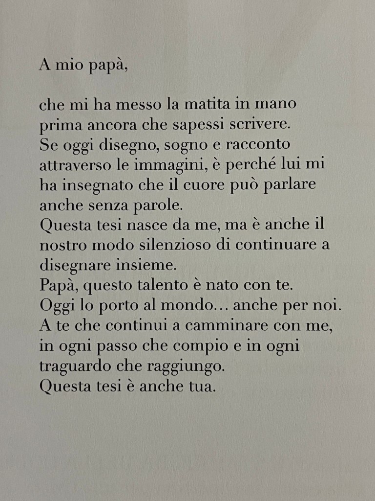 La tesi di Marta, come lei stessa scrive, è il loro “modo silenzioso di continuare a disegnare insieme”, un ponte emotivo che lega il traguardo accademico al ricordo e alla trasmissione di una passione.