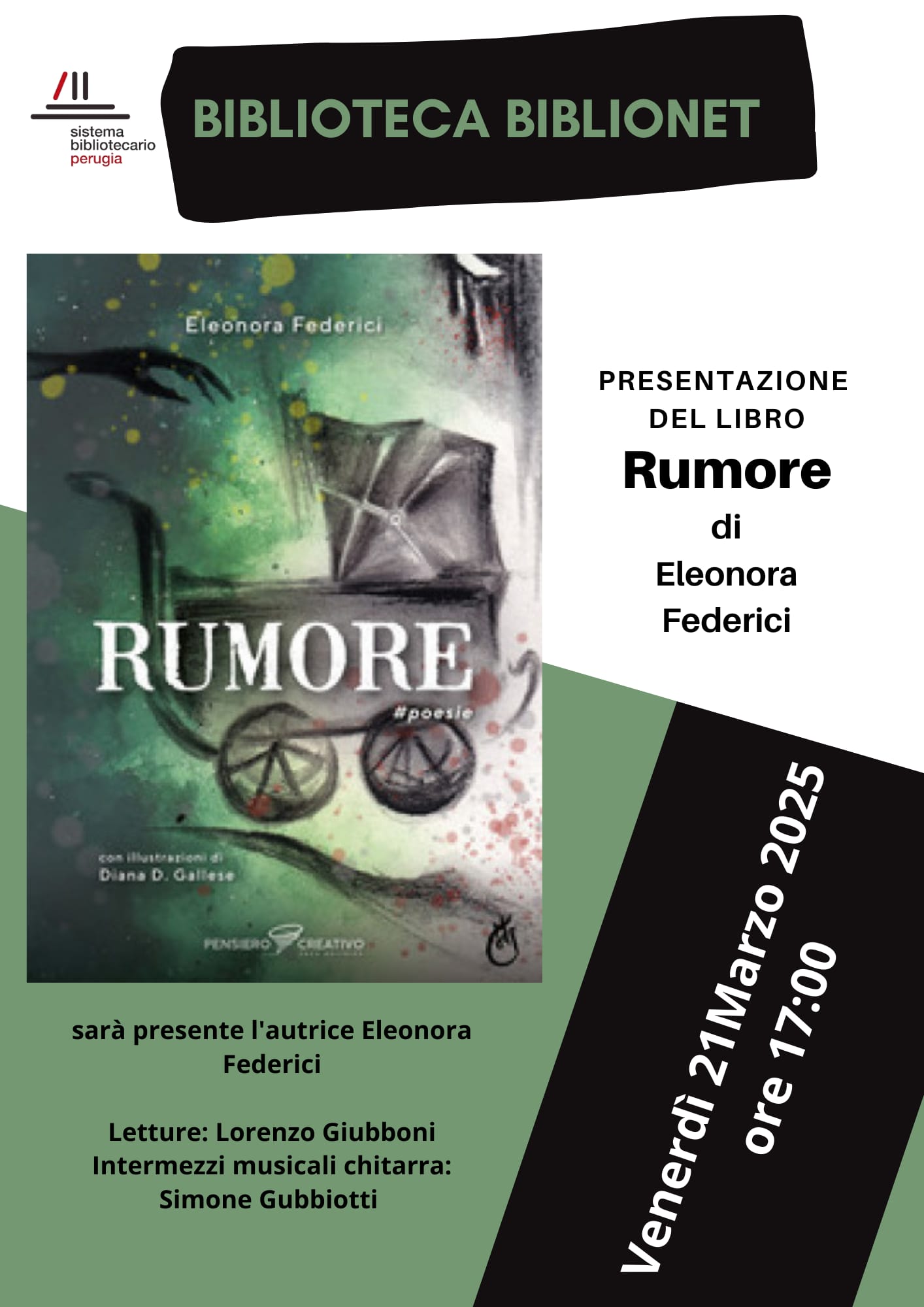 Venerdì 21 Marzo alle ore 17 la Biblioteca Biblionet di Ponte San Giovanni a Peugia ospita la nuova presentazione di “Rumore”, raccolta poetica di Eleonora Federici edita da Agenzia Pensiero Creativo.