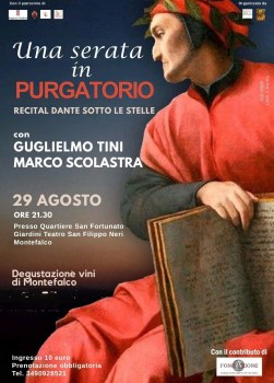 La Pro Loco Montefalco, in collaborazione con il Quartiere San Fortunato, presenta “Una serata in Purgatorio”, recital dedicato a Dante Alighieri, che si terrà venerdì 29 agosto alle ore 21.30 presso la suggestiva Taverna San Fortunato, nei giardini del Teatro San Filippo Neri.