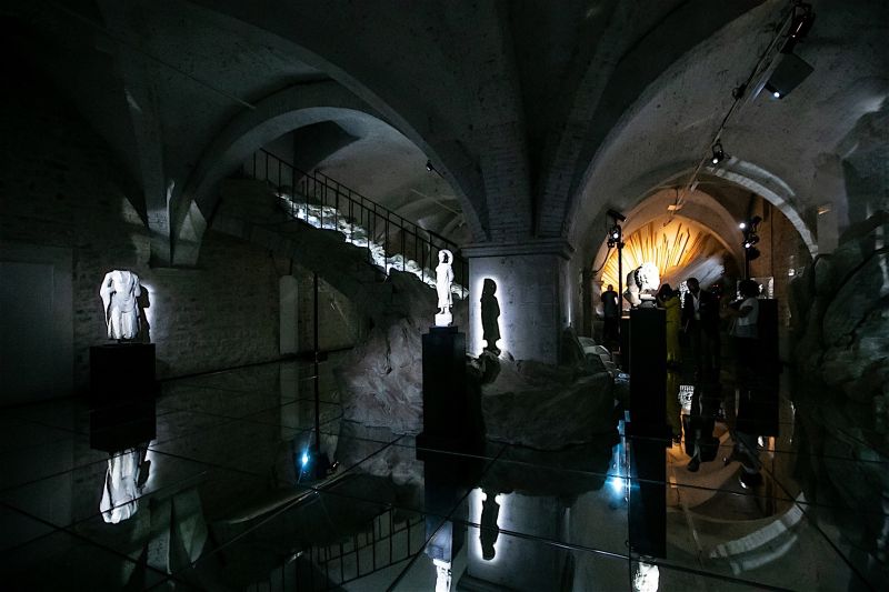 La prima installazione, MITI, TRASFIGURAZIONI, (Armeria Lucrezia Borgia ex Museo Civico), curata da Quirino Conti con la consulenza scientifica di Marco Galli, Sapienza Università di Roma, e di Laura Giuliano, Museo delle Civiltà di Roma si propone di mettere in dialogo Oriente e Occidente, due mondi che si sono incontrati più di duemila anni fa, con l’esposizione di 23 opere: una serie di sculture e alcuni rilievi, di cui 14 scisti orientali (II-IV sec. d.C) provenienti dalla regione del Gandhāra insieme a 9 marmi classici occidentali (II sec. d.C.) di epoca greco-romana. Un racconto sul bisogno di ricerca dell’Assoluto da parte dell’Uomo che si concretizza nei preziosi Buddha e Bodhisattva in meditazione e nelle creature mitiche o mitizzate greco-romane.