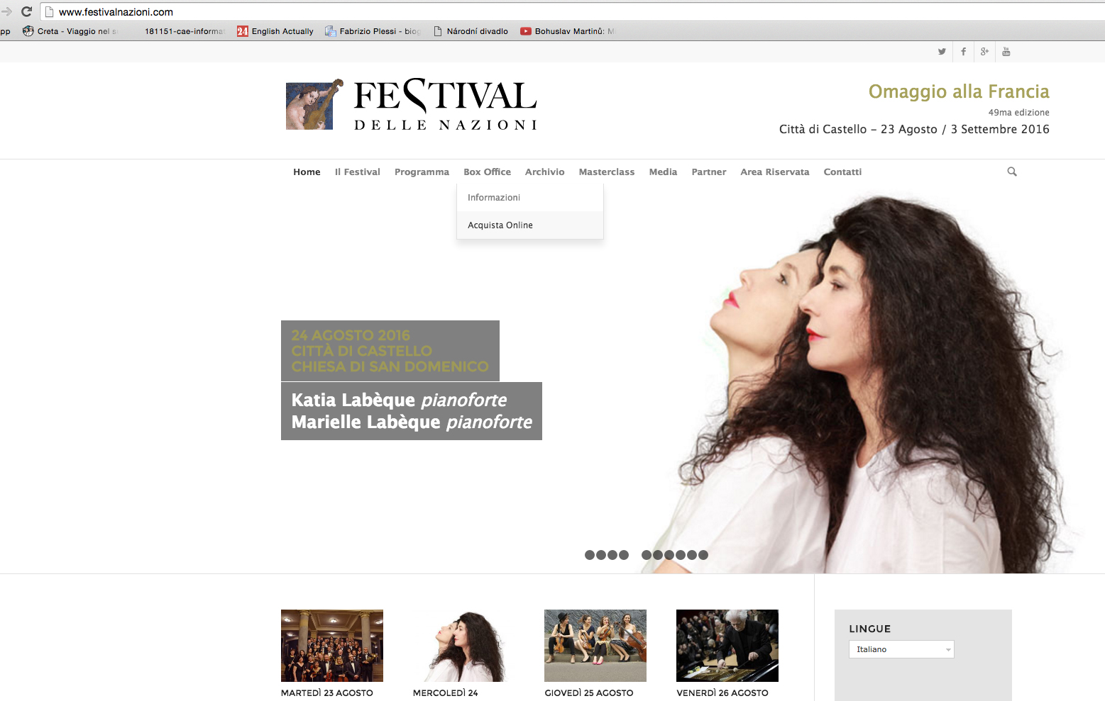 È iniziata la vendita online dei biglietti per la 49a edizione del Festival delle Nazioni. Per assicurarsi un posto ai concerti in programma dal 23 agosto al 3 settembre 2016, da oggi è possibile acquistare uno o più ticket collegandosi al sito del Festival delle Nazioni (www.festivalnazioni.com, sezione BOX OFFICE – Acquista online) e accedendo alla piattaforma Vivaticket.
