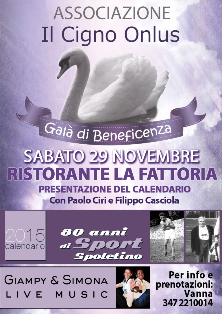 L’attività de Il Cigno naturalmente non si ferma e così quest’anno si rinnova l’esperienza fortunata del calendario con un evento di beneficenza legato ad un momento conviviale che si terrà il 29 novembre, presso il ristorante La Fattoria. Il calendario di quest’anno è dedicato agli 80 anni di Sport spoletino. Verranno ricordati tutti i principali protagonisti che nel tempo hanno contribuito con passione alla pratica sportiva della città portandola in alcuni casi alla ribalta nazionale. La presentazione del calendario sarà affidata ai giornalisti Paolo Ciri e Filippo Casciola mentre i momenti musicali sono affidati al duo Giampy&Simona