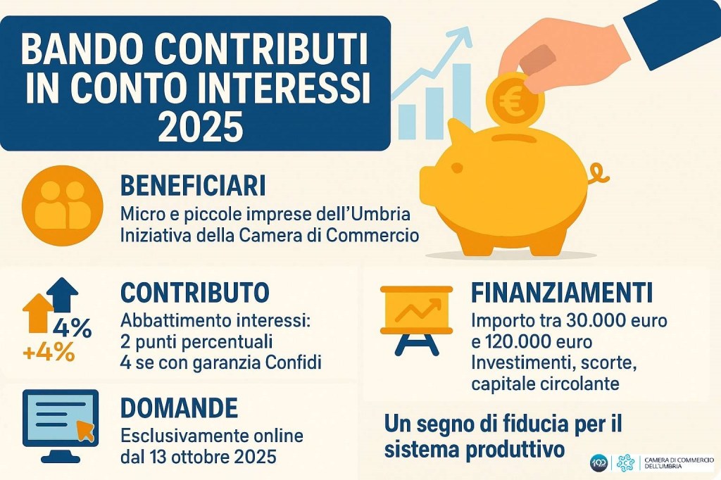 Bando contributi in conto interessi 2025, la Camera di Commercio dell’Umbria meette a disposizione 500mila euro complessivi a favore delle imprese locali per abbattere il peso degli interessi sui finanziamenti bancari o garantiti dai Confidi vigilati.