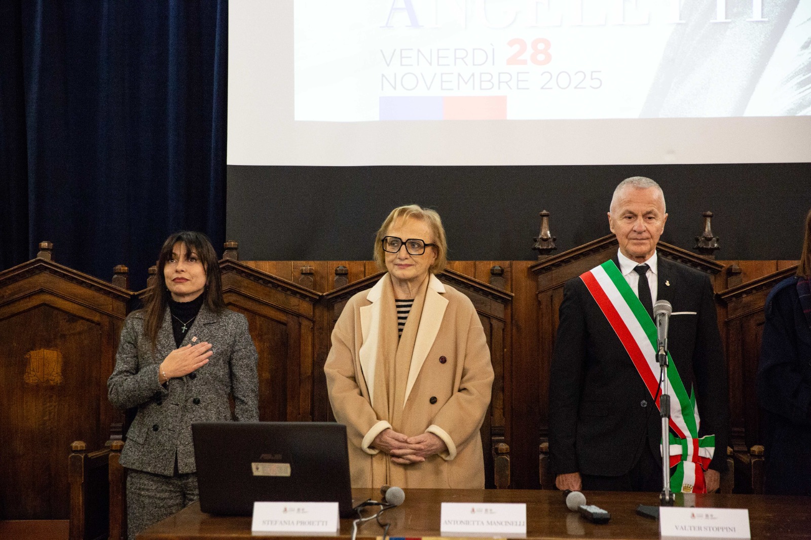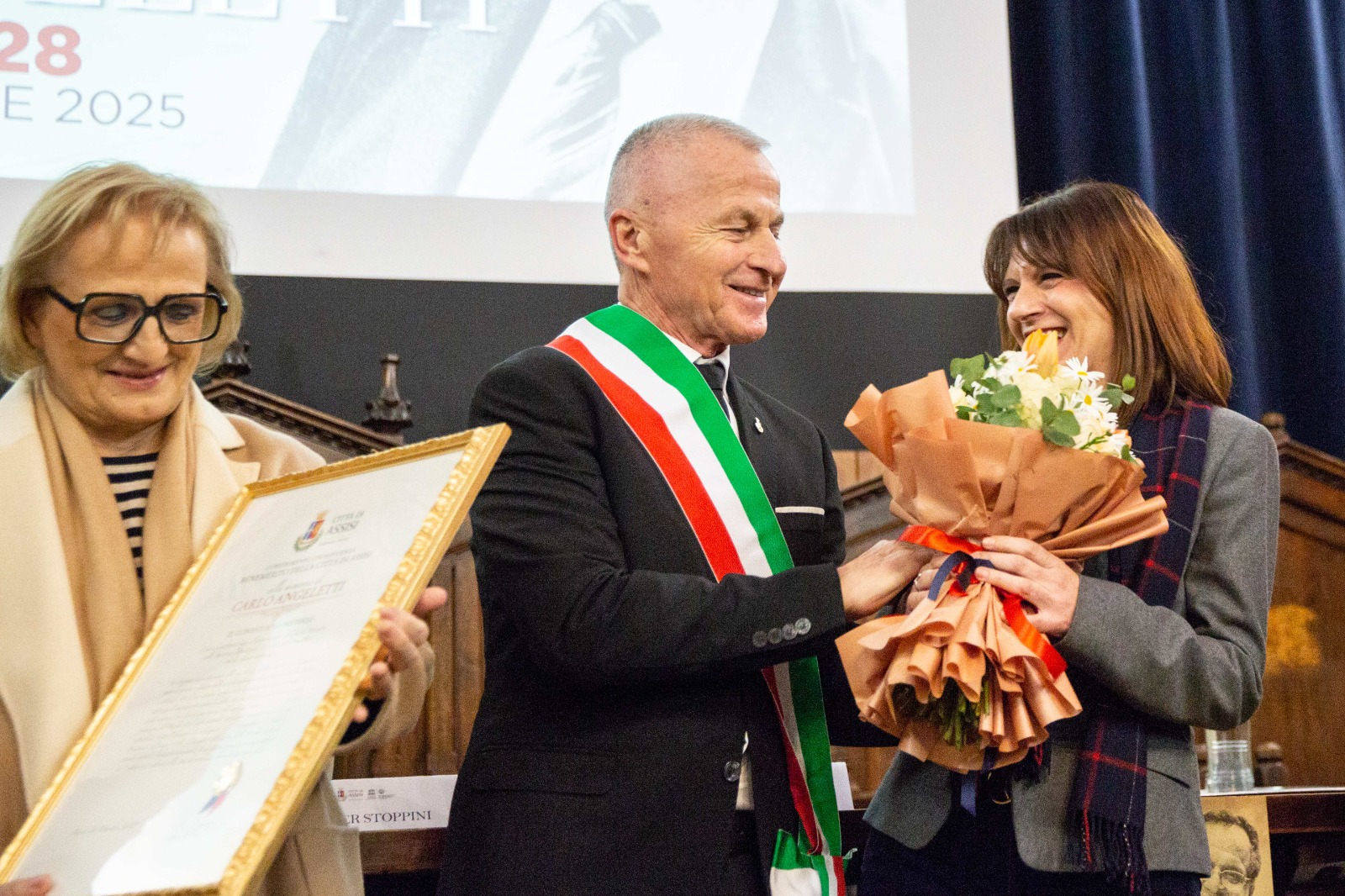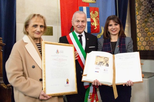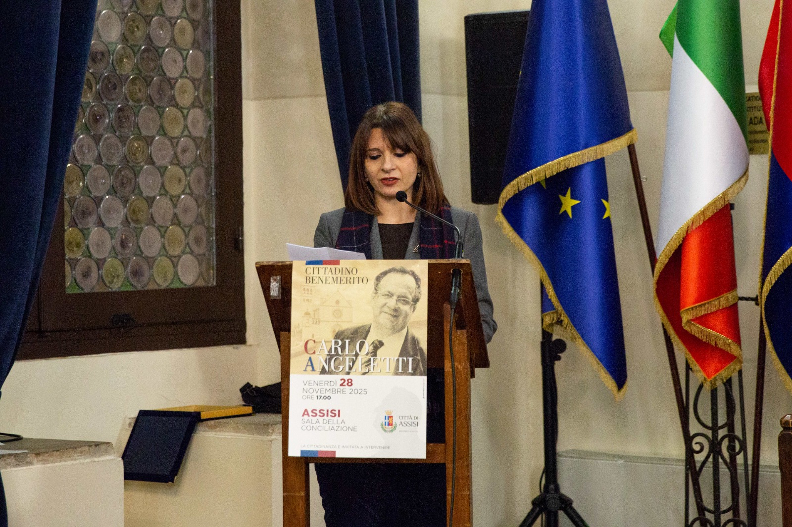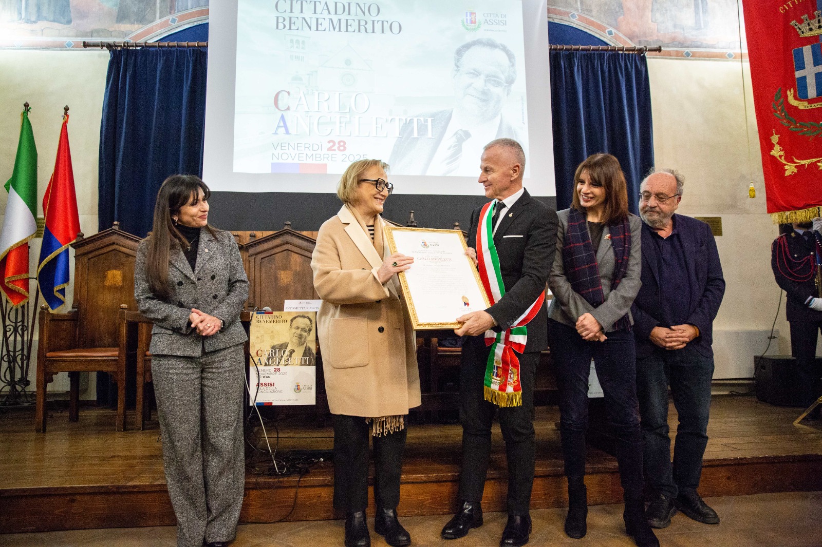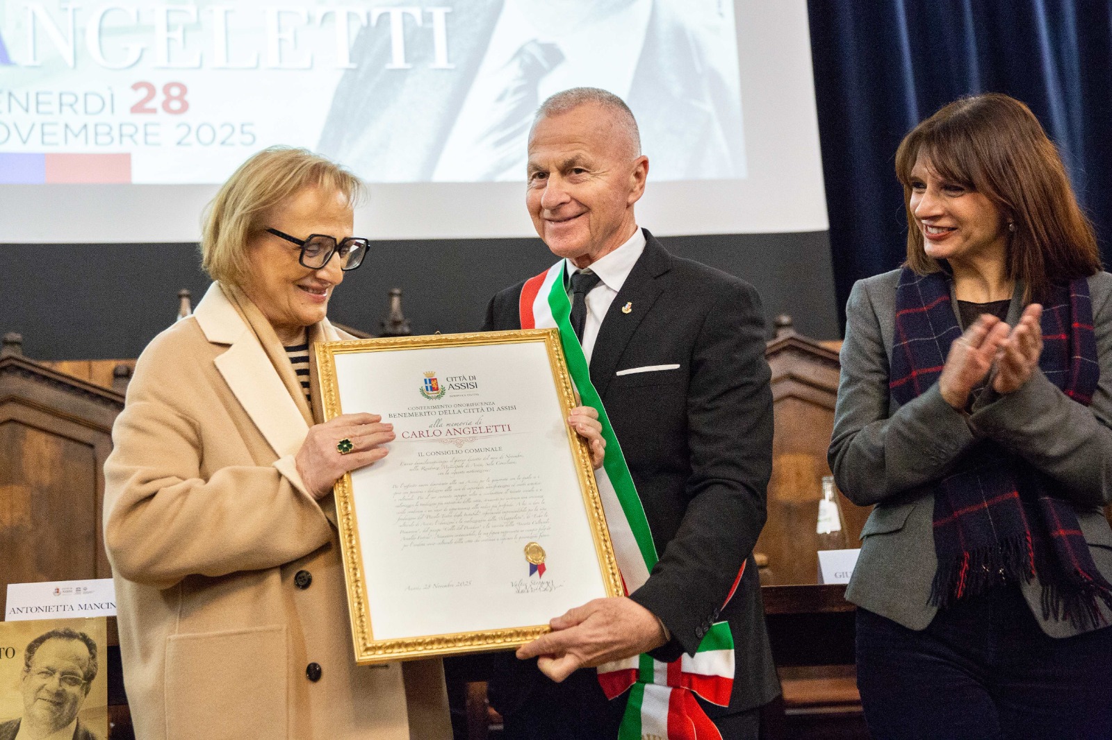 Il riconoscimento – rappresentato da una pergamena con i motivi dello stesso e il sigillo d’oro della città – è stato consegnato alla moglie Antonietta Mancinelli e alla figlia Fulvia Angeletti dal sindaco di Assisi Valter Stoppini, presenti anche la presidente della Regione Umbria Stefania Proietti, la presidente del Consiglio comunale Annalisa Rossi, componenti della giunta comunale, diversi consiglieri comunali, il custode del Sacro Convento di Assisi fr. Marco Moroni, il giornalista e coordinatore di Articolo 21 Beppe Giulietti, rappresentanti delle forze dell’ordine e del tessuto associativo della città, familiari e amici di Carlo Angeletti. “Ci sono persone – ha detto il primo cittadino – che hanno la capacità di trasformare in meglio il posto in cui vivono, perché si sentono tutt’uno con la storia della città e si adoperano per conservarla e divulgarla: Carlo Angeletti era una di queste”. “Era una persona autentica – ha sottolineato la presidente Proietti – attenta a tutto il territorio della città e alle sue tradizioni più autentiche e innamorato di Assisi”. La famiglia, con la figlia Fulvia, ha portato un ricordo personale del padre, ma sempre legato alla vita della città, mentre Giulietti ha descritto Angeletti come “un uomo sensibile, gentile e rispettoso, che ha rappresentato pienamente lo spirito di Assisi, che è anche allegra e prorompente. È stato una sempre una sentinella civica per la comunità”. Fra Moroni ha parlato di “una persona fondamentale per Assisi e molto amica della comunità francescana: familiarità e amicizia erano i suoi tratti distintivi”.