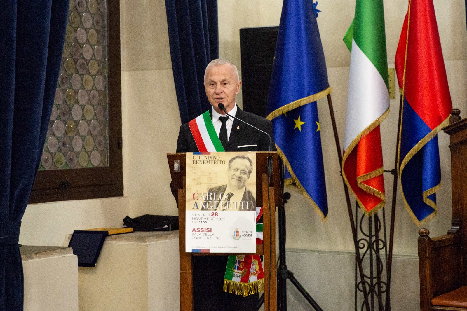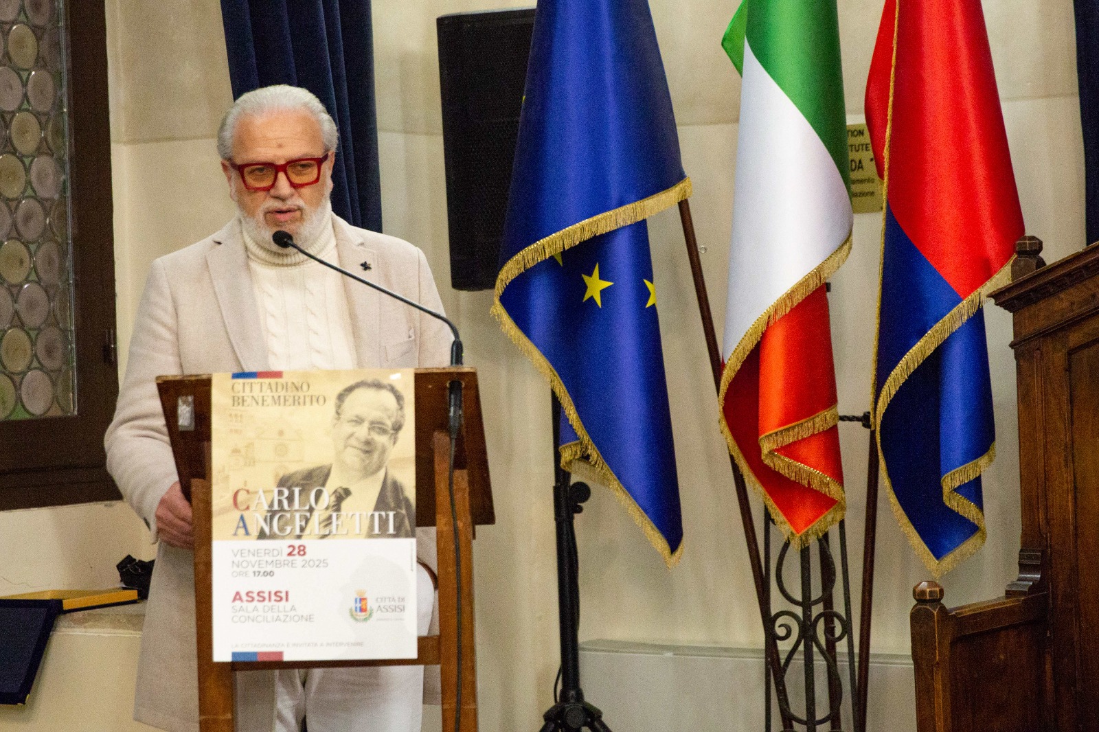 Il titolo – assegnato a quanti si sono particolarmente distinti nella loro opera in vari campi, dando lustro ad Assisi e rendendo un servizio importante alla comunità – era stato deliberato all’unanimità dal Consiglio comunale, il 18 novembre 2025. La motivazione è la seguente: “Per l’infinito amore dimostrato alla sua Assisi, per la generosità con la quale si è speso con passione e dedizione alla cura di importanti manifestazioni ed eventi artistici e culturali. Per il suo costante impegno volto a riconnettere il tessuto sociale e a valorizzare le tradizioni più autentiche della Città, strumenti per costruire una coscienza civile condivisa e un senso di appartenenza alle radici più profonde. A lui si deve la fondazione del Piccolo Teatro degli Instabili, riferimento imprescindibile per la vita culturale di Assisi, l’ideazione e la realizzazione della Maggiolata, di Echo la Primavera, del presepe Colle del Paradiso e la nascita della Società Culturale Arnaldo Fortini. Animatore instancabile, la sua figura rappresenta un esempio fulgido per l’eredità socio-culturale della Città che continua a ispirare le generazioni future”.