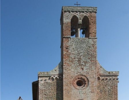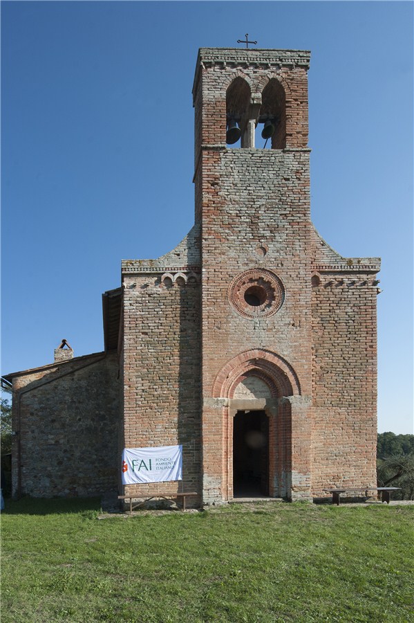 Giunti sul prato antistante il complesso sacro sarà impossibile non notare i numerosi motivi decorativi che ornano il perimetro esterno della chiesa, come pure i piccoli graffiti di carattere sacro sugli stipiti del portale di ingresso scolpiti nei secoli dai pellegrini: qui infatti essi trovavano ristoro durante il loro viaggio verso Roma.
