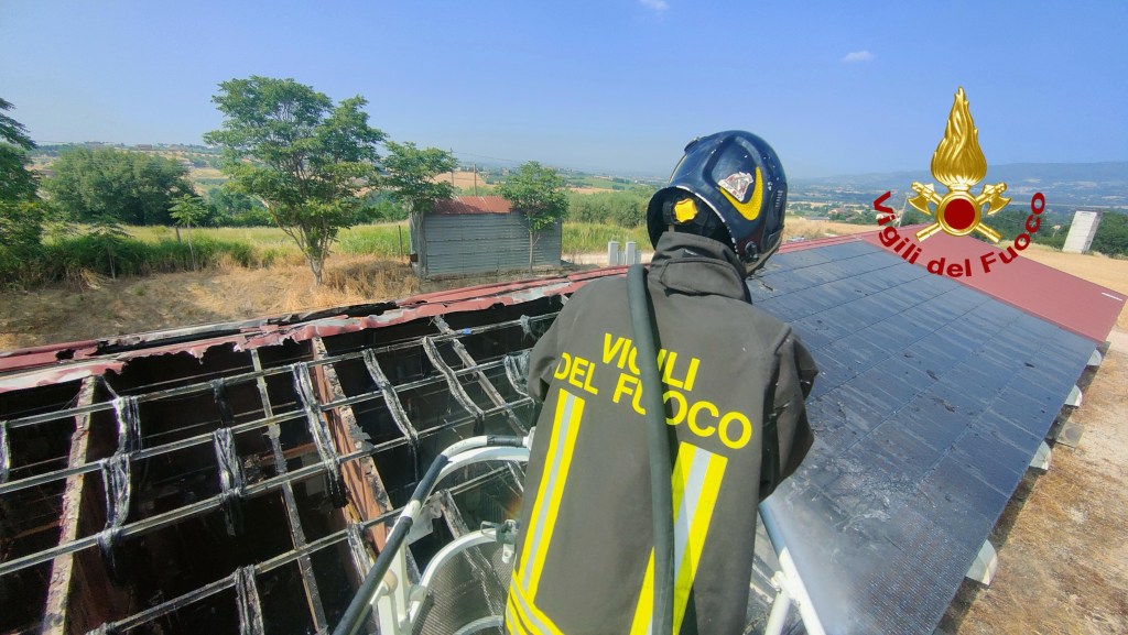 A fuoco il tetto di un capannone agricolo, coperto dai pannelli solari di un impianto fotovoltaico. Le squadre dei vigili del fuoco della sede centrale di Perugia sono intervenute nel territorio comunale di Marsciano, vocabolo Cerquella.