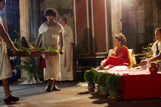 Con loro, ogni sera un viaggio nel tempo affidato a menu sempre diversi, ma soprattutto capaci di far vivere l’esperienza unica di sedersi alla tavola dei Romani e dove tutto sarà come allora. Dalla Gustatio, alla Prima Cena, all’Altera Cena, per concludersi con le Secundae Mensae – ovvero dall’antipasto al dolce – tutto sarà una scoperta, sorprendente e gustosa. Con un pensiero anche a celiaci e bambini ai quali sono dedicati dedica menu alternativi. “Piatti e bevande sono ogni sera il frutto di un lungo lavoro di studio, di ricerca, ma soprattutto della messa a punto di sapori ispirati alla cucina romana e che riescano a intrecciare la filologia, gli antichi ricettari con il gusto di noi moderni – commenta Daniele Falchi -. Basti pensare che alcuni ingredienti non esistono più, mentre altri sono giunti alla contemporaneità inalterati. Come la risina di Spello, un fagiolo di origine orientale che oggi come allora troviamo sulle nostre tavole. O i fegatelli, cibo rituale che derivando ai Romani e a noi dagli Etruschi, hanno una storia ancor più lontana che ci portiamo con noi da ben 3000 anni”. Ma Hispellvm 2025 ha in serbo dell’altro. Attesissima novità la Popina di Venere accolta nello splendore cinquecentesco del giardino all’italiana di Villa Fidelia, dove anticamente sorgeva il santuario federale di Umbri e Romani e un tempio dedicato a Venere. Nei pressi della Limonaia, la Popina sarà dal 18 al 20 agosto, dalle 18 alle 23, luogo d’incanto per “aperitivi” ispirati alla Gustatio romana. Anche qui in compagnia di musiche, danze e intermezzi letterari. Anche qui la firma è quella del binomio Panfili-Falchi. Ma piatti, stuzzichini e bevande, ispirati alle antiche ricette saranno anche la proposta delle Tabernae, delle Popinae e dei Thermopolia che animeranno vie e piazze del centro astorico di Spello. Per una proposta più veloce, una pausa storico-gourmet tra gli eventi della settimana. Così come la Taverna Costantino Imperatore sarà aperta in via straordinaria a pranzo per degustazioni di pietanze ispirate all’antica cucina romana nei giorni 19 e 20 agosto. “Sarà un piccolo viaggio nelle abitudini antiche – prosegue Daniele Falchi -. Un affaccio su pratiche e abitudini di cui abbiamo traccia nelle ricette giunte fino a noi e che ci permettono di sperimentare sapori e sprazzi sensoriali, dominati dall’agrodolce, filtrati attraverso il nostro gusto attuale.”.
