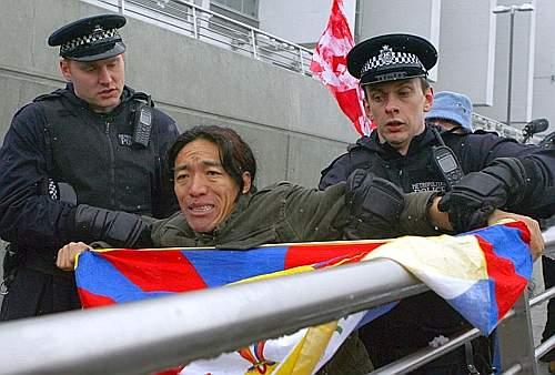 Ciò che si paventava da più parti e da molti giorni ormai, è davvero accaduto. Alla quarta tappa del suo percorso, la fiaccola olimpica ha acceso la rabbia di chi solidarizza con i monaci tibetani, impegnati dal 10 marzo scorso in una campagna contro la dominazione cinese della regione. I primi due manifestanti ad essere arrestati sono stati Martin Wyness e Ashley Darby, che avevano scritto “estintori di propaganda” su due estintori e con essi si sono gettati sul tedoforo Chris Parker, mentre questi la stava passando al tedoforo successivo. Sono stati immediatamente bloccati dalla polizia. I due avevano già diffuso una dichiarazione, nella quale dicono di non avercela «contro il popolo cinese, ma contro il brutale regime che li governa, con il suo orribile trattamento dei diritti umani. La Cina non ha diritto di far passare la fiaccola da Londra». Un altro arresto, avvenuto poco distante, è stato mostrato dalle tv: un dimostrante che tentava di strappare la torcia a una presentatrice della Bbc, Konnie Huq. Alla fine, le persone fermate dalla polizia sono state almeno 35. A un certo punto, addirittura, la protesta di un centinaio di attivisti ha consigliato a polizia e organizzatori di ricorrere a un 'passaggio in autobus' per far arrivare la staffetta davanti alla Cattedrale di St.Paul: il tedoforo circondato e la fiamma sono stati tolti dalla strada e fatti salire a bordo di uno dei mezzi al seguito.I disordini hanno spinto l'ambasciatore cinese a Londra a portare la fiaccola su un tratto diverso da quello preventivato. Londra è la quarta tappa dopo Almaty, Istanbul e San Pietroburgo del tour mondiale che la fiamma olimpica aveva intrapreso il primo aprile da Pechino, che sarà sede del super-evento sportivo di agosto. La prossima tappa sarà Parigi dove già sono pronti 3mila agenti.