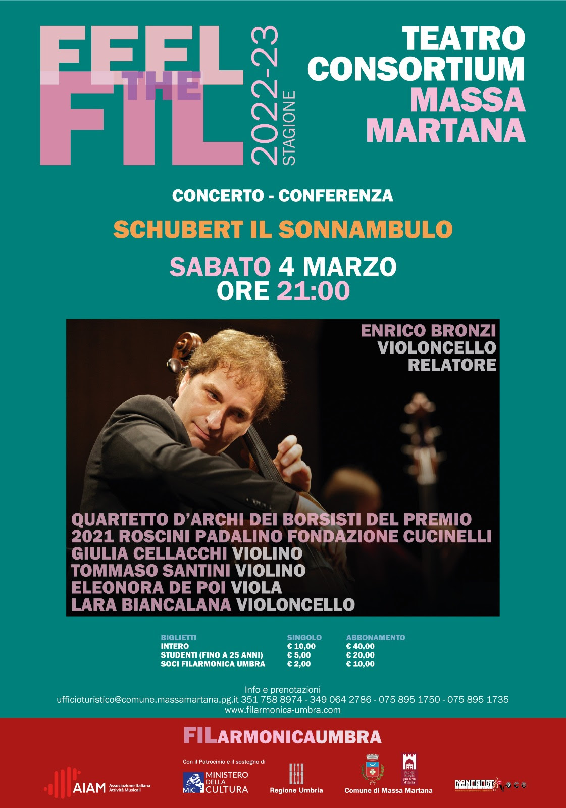 Dopo il successo dei primi concerti del 2023, sabato 4 marzo al Teatro Consortium di Massa Martana, alle ore 21.00, il pubblico della Filarmonica Umbra sarà ospite di un concerto-conferenza a cura del celebre violoncellista Enrico Bronzi, che vestirà anche gli abiti di relatore, e del QUARTETTO D’ARCHI dei borsisti del Premio 2021 Roscini-Padalino e Fondazione Cucinelli (Giulia CELLACCHI violino – Tommaso SANTINI violino – Eleonora DE POI viola – Lara BIANCALANA violoncello).