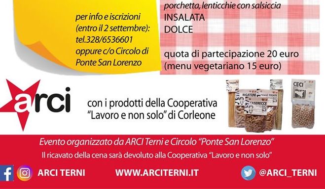 Per questo è ancora più importante sostenere l’attività della “Lavoro e non solo”. Il ricavato della serata del 6 settembre sarà devoluto alla Cooperativa. Per informazioni ed iscrizioni consultare il sito internet www.arciterni.it oppure i canali social del Comitato ARCI di Terni.