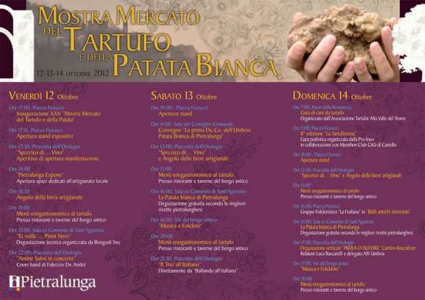 Ale. Chi. – Musica, folklore, mostre e degustazioni per festeggiare la patata bianca e il tartufo: accadrà a Pietralunga, da domani venerdì 12 ottobre fino a domenica 14. Si presenta così la 25esima Mostra mercato del tartufo e della patata bianca , che per tre giorni allieterà la vita tranquilla del borgo umbro.