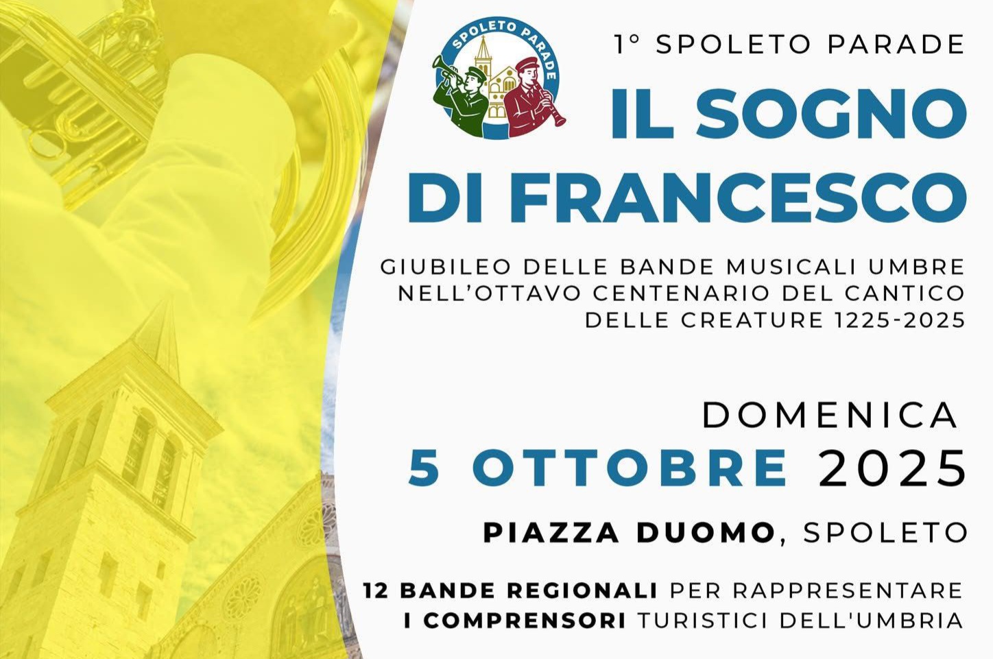 Le bande musicali dell’Umbria si ritroveranno in Piazza Duomo a Spoleto, domenica 5 ottobre, per la prima Spoleto Parade: “Il sogno di Francesco”, l’evento ideato dalla Banda musicale «Città di Spoleto» in collaborazione con il Comune e l’Archidiocesi di Spoleto – Norcia. In un anno doppiamente significativo – l’ottavo Centenario del Cantico delle Creature (1225-2025) e l’apertura ufficiale del Centenario Francescano – l’evento celebra il Giubileo delle Bande Musicali Umbre, trasformando il centro storico in un palcoscenico a cielo aperto, dove festa, tradizione e amicizia si fonderanno in una grande parata musicale.