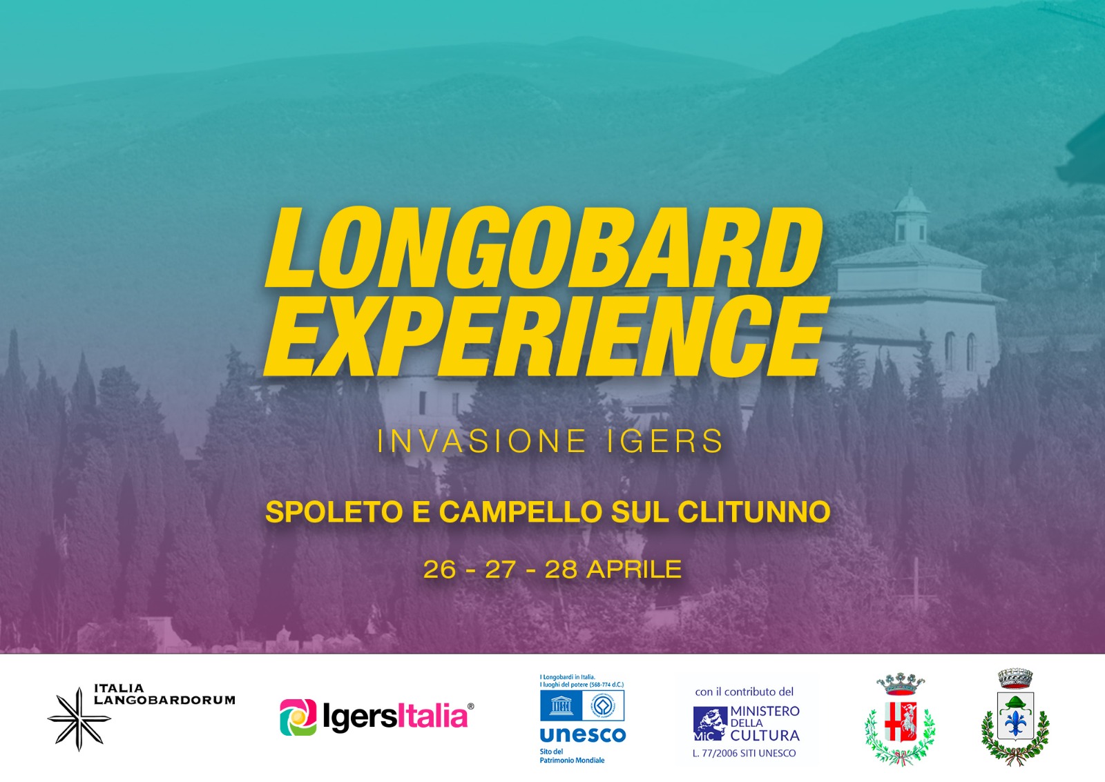 Si terrà a Spoleto (Pg) e Campello sul Clitunno (Pg), da venerdì 26 a domenica 28 aprile 2024, la sesta ed ultima tappa delle #LongobardExperience, l’iniziativa digitale promossa in partnership tra IgersItalia, l’Associazione Italia Langobardorum, il Comune di Spoleto ed il Comune di Campello sul Cliutunno, allo scopo di illustrare, attraverso il web e gli strumenti social, le testimonianze della civiltà dei Longobardi in Italia.