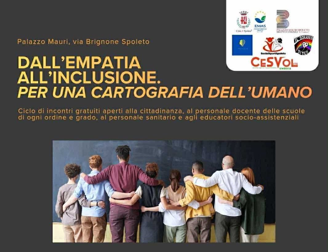 Il 21 Novembre prenderà il via presso Palazzo Mauri un ciclo di incontri mensili dal titolo “Dall’empatia all’inclusione. Per una cartografia dell’umano”, iniziativa ideata e organizzata dal PhenoLab (referente scientifico del ciclo di incontri) in collaborazione con il Comune di Spoleto, Social Sport Spoleto e Il sorriso di Teo, e patrocinata dal Cesvol (Centro Servizi Volontariato) Umbria.