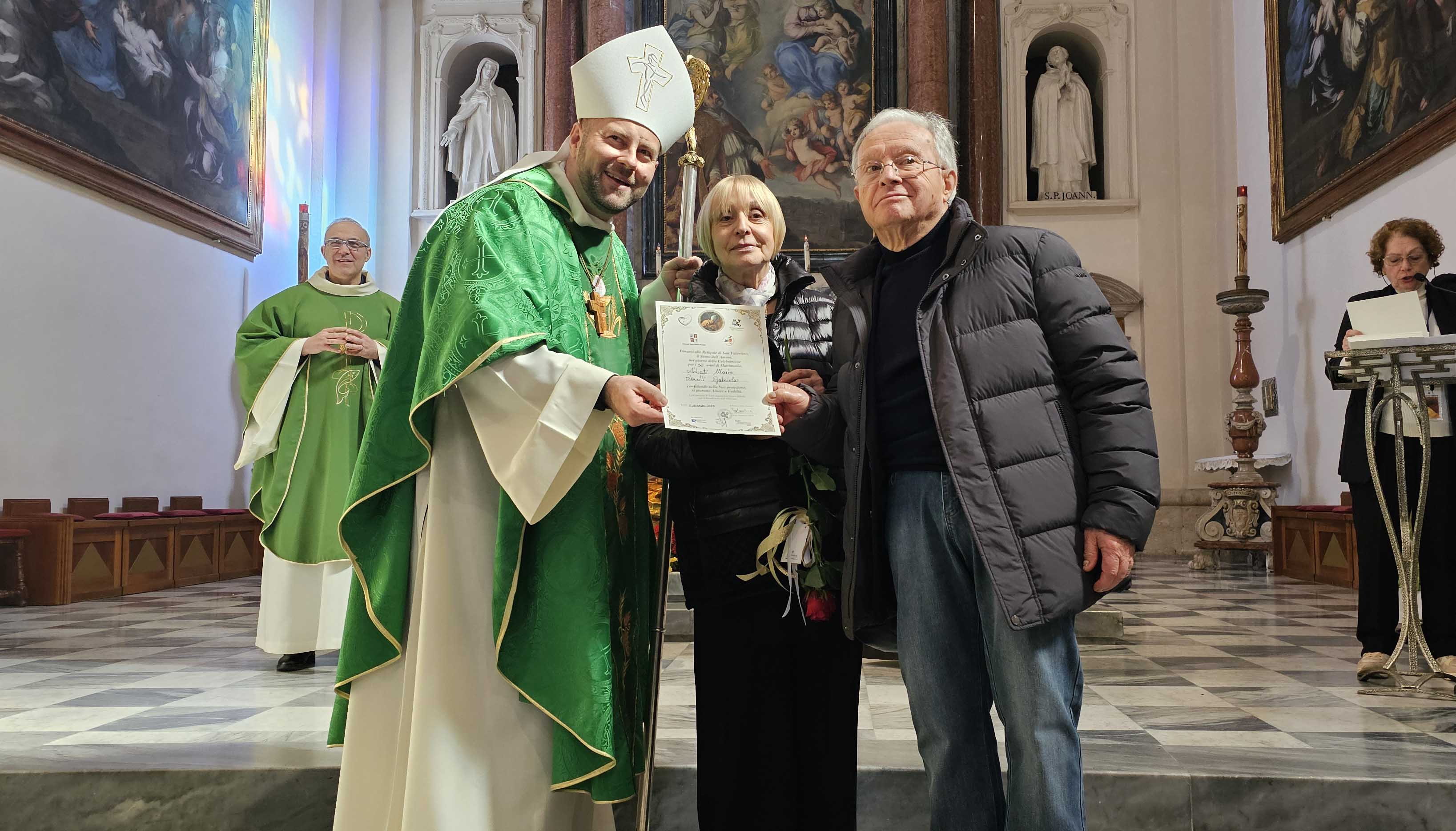 Un incontro che celebra l’amore sponsale e familiare, sottolineando il valore forte della famiglia per la crescita dei figli e nella trasmissione dei valori e della fede. La tradizione della celebrazione della ricorrenza dei 50 anni di matrimonio nella basilica di San Valentino, che si rinnova da trenta anni, rappresenta una grande preghiera corale per le famiglie perché s’irrobustisca l’amore reciproco, l’attenzione e la tenerezza nel prendersi cura gli uni degli altri con sincerità e rispetto. “Benedetto sei Padre, perché ci hai benignamente assistito nelle vicende tristi e liete della vita; aiutaci con la Tua Grazia a rimanere sempre fedeli nel reciproco amore” le parole pronunciate dalle coppie di sposi.