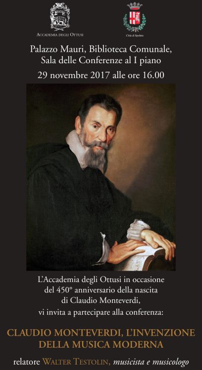 Il 29 novembre 1643 moriva a Venezia Claudio Monteverdi. L’Accademia degli Ottusi intende proporre mercoledì 29 novembre alle ore 16 nella Biblioteca Comunale di Palazzo Mauri un incontro sulla vita e la musica di Monteverdi ad opera di Walter Testolin, uno studioso e musicista che da tempo si occupa ai massimi livelli dell’esecuzione del repertorio polifonico rinascimentale, tanto da esserne un interprete di riferimento a livello internazionale. Un cammino curioso fatto di parole, ascolti e immagini, attraverso la musica, le lettere, i segreti, le innovazioni e le rivoluzioni del più grande e influente musicista italiano. A quattrocentocinquanta anni dalla nascita, nel giorno in cui veniva accolto nel suo Permesso amato.