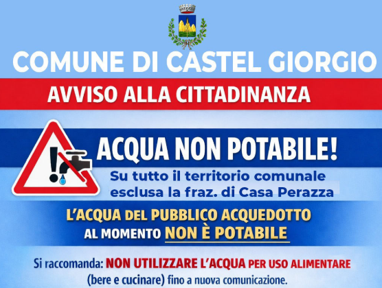 Il Servizio Idrico Integrato di Terni informa la cittadinanza del Comune di Castel Giorgio che, a partire dalle 20 di ieri, venerdì 20 febbraio, è stata posizionata un’autobotte in piazza Anna Frank e a partire dalle 21 al parcheggio della zona industriale Le Piane ed in Piazzale Falcone per l’approvvigionamento idrico, a seguito dell’ordinanza di non potabilità dell’acqua emanata dal sindaco Andrea Garbini per tutto il territorio comunale, esclusa la frazione di Casa Perazza.