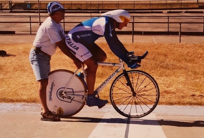Nella foto è insieme a Paolo lo “stagnino” al velodromo Vito Taccone di Avezzano per preparare il record dell’ora, era il 2004.