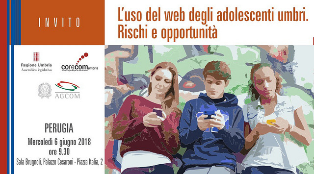 Mercoledì 6 giugno 2018, alle ore 9.30, nella Sala Brugnoli di Palazzo Cesaroni, presentazione della ricerca “L’uso del web degli adolescenti umbri. Rischi e opportunità” commissionata dal Corecom (Comitato regionale per le comunicazioni) Umbria alla professoressa Maria Giuseppina Pacilli dell’Università degli Studi di Perugia.