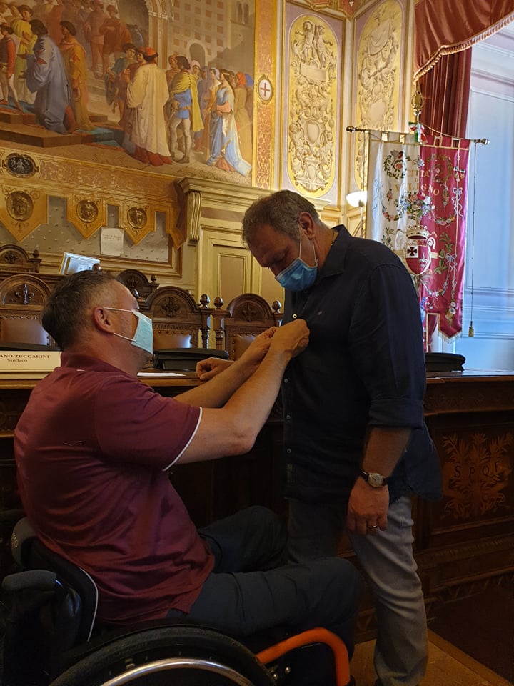 La spilla con lo stemma della città è l’onorificenza che il sindaco Stefano Zuccarini ha consegnato all’agente eroe della polizia municipale Claudio Tamburo, per ringraziarlo del fatto che nel corso della sua attività abbia salvato la vita a quattro persone.