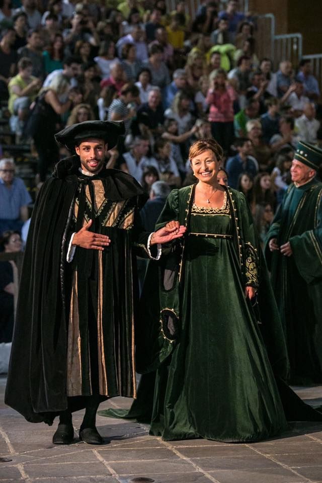Figure ormai emblematiche di ciascun Quartiere, noti per la perizia oltre i confini del territorio, gli Sbandieratori e Tamburini di Montefalco faranno uno spettacolo entusiasmante, un rutilare di bandiere, colori e ritmi nella magica atmosfera della Piazza rinascimentale della Città di Montefalco. Fulcro centrale della serata sarà anche quest’anno la gara per il “Miglior Corteggio”: saranno valutati i quattro cortei sapientemente organizzati dei responsabili dei cortei dei quartieri che attraverso uno scrupoloso studio, allestiscono veri e propri capolavori che ci fanno tornare indietro nel tempo delle “Madame e dei Messere”. Il premio per il miglior corteggio è stato realizzato dall’associazione “Un Sorriso per Te” amici di Michela Ponti; dopo il giudizio dei giudici che osserveranno i costumi, il portamento e l’effetto scenico complessivo del corteo il premio sarà consegnato da Leonardo Orsini, presidente dell’Associazione, Manuela Ponti e dal sindaco Donatella Tesei, insieme al presidente dell’Ente Paolo Felicetti. La narrazione della serata è affidata a Gilberto Scalabrini.