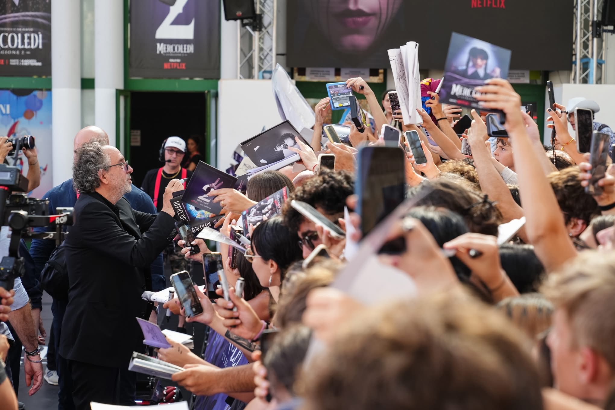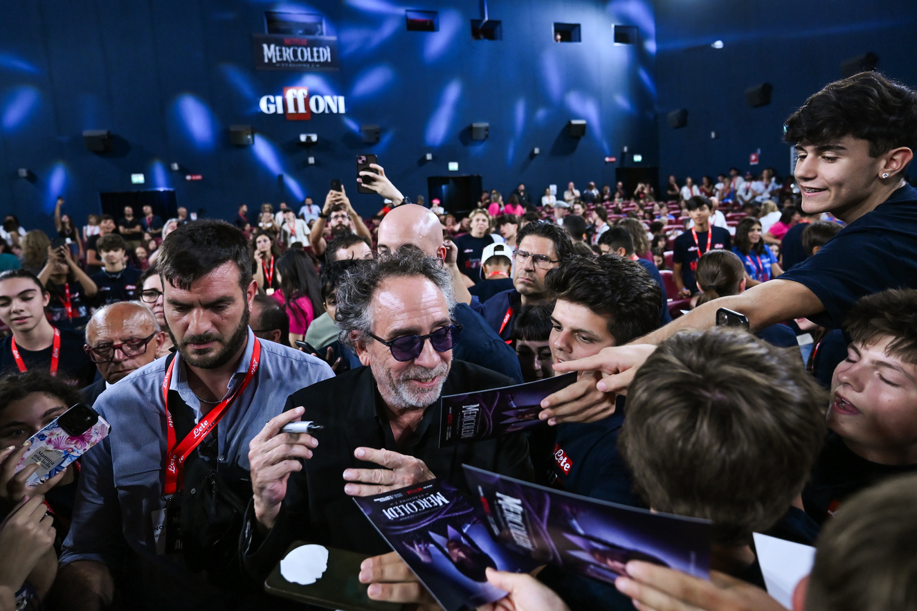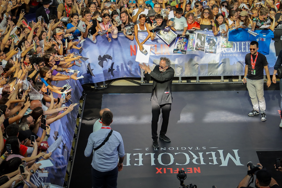 Gotico, iconico, geniale. Totalmente fuori le righe dell’ordinario quanto generoso, generosissimo, con un pubblico immenso che lo aspettava fin dalle prime ore della giornata ai margini del carpet della Sala Truffaut per un autografo, una foto o, semplicemente, per poter guardare negli occhi chi ha fatto da guida spirituale con i suoi film, restandone folgorato. Tim Burton è senza dubbio la star di #Giffoni55. In total black, è arrivato alla Cittadella del Cinema in compagnia di Monica Bellucci, talent a sorpresa che non ha lesinato sorrisi e saluti prima di lasciare il palco al grande regista internazionale, a Giffoni in occasione dell’arrivo su Netflix della seconda stagione di “Mercoledì” – con la parte 1 disponibile dal 6 agosto e la parte 2 dal 3 settembre.