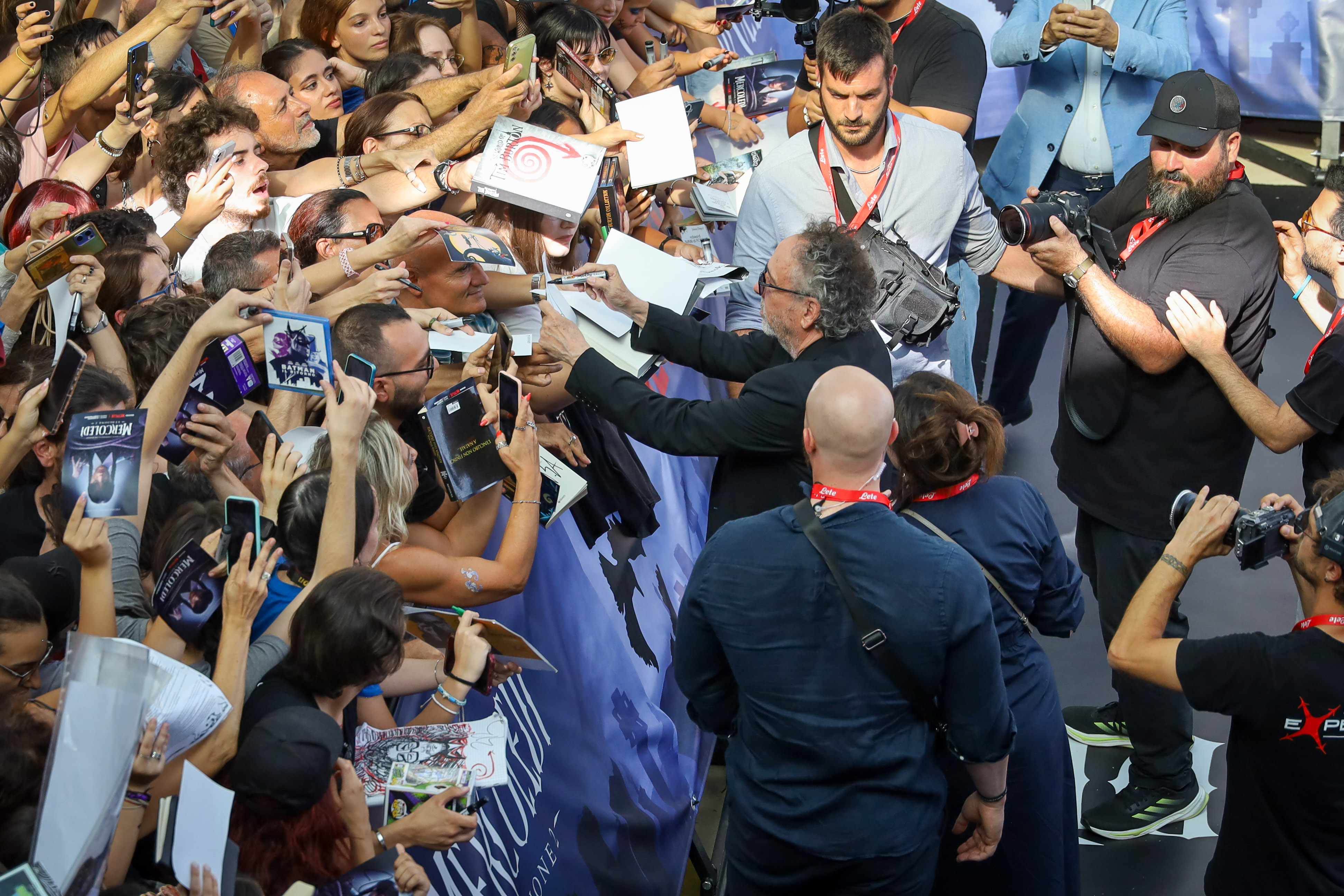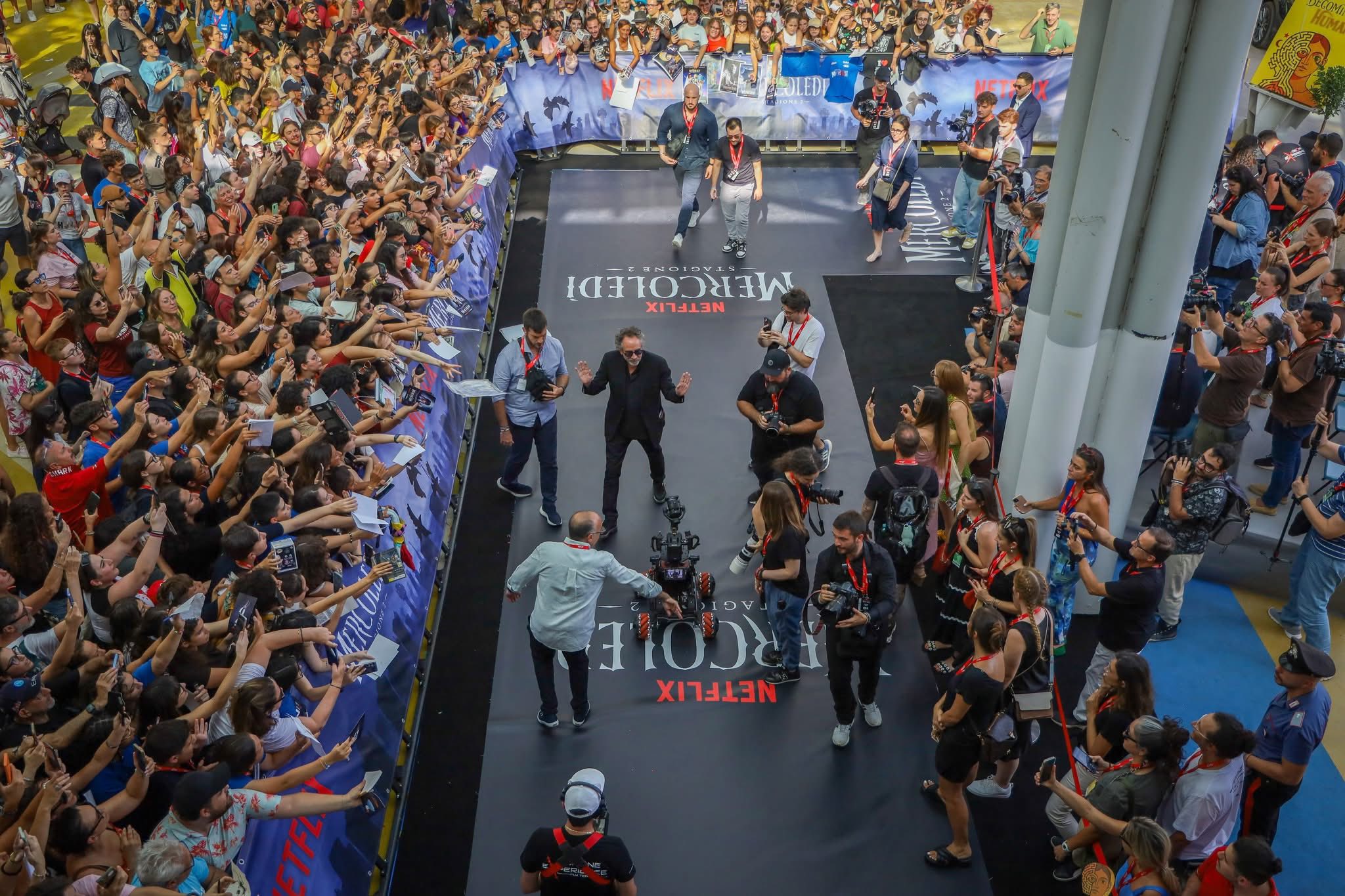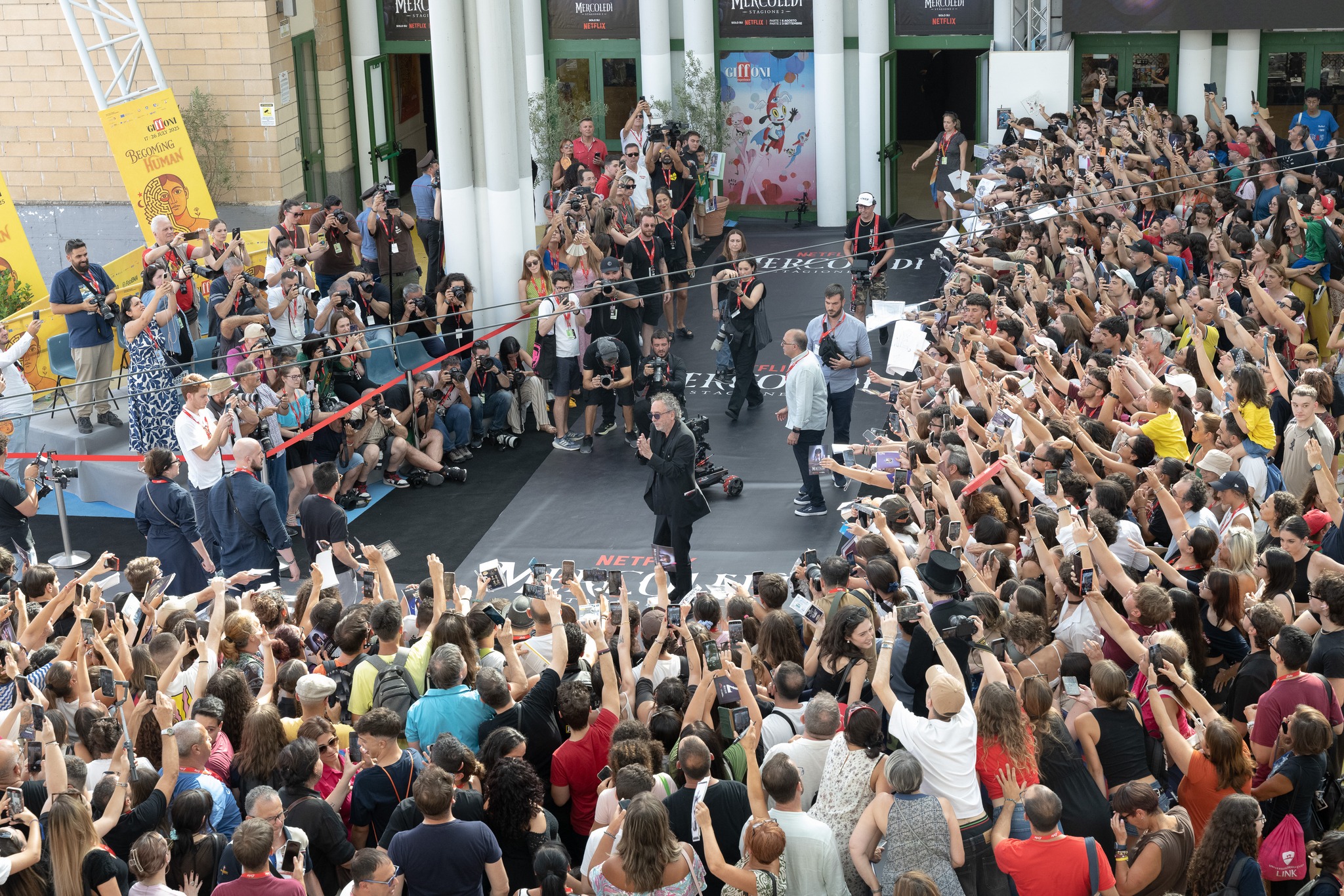 Gotico, iconico, geniale. Totalmente fuori le righe dell’ordinario quanto generoso, generosissimo, con un pubblico immenso che lo aspettava fin dalle prime ore della giornata ai margini del carpet della Sala Truffaut per un autografo, una foto o, semplicemente, per poter guardare negli occhi chi ha fatto da guida spirituale con i suoi film, restandone folgorato. Tim Burton è senza dubbio la star di #Giffoni55. In total black, è arrivato alla Cittadella del Cinema in compagnia di Monica Bellucci, talent a sorpresa che non ha lesinato sorrisi e saluti prima di lasciare il palco al grande regista internazionale, a Giffoni in occasione dell’arrivo su Netflix della seconda stagione di “Mercoledì” – con la parte 1 disponibile dal 6 agosto e la parte 2 dal 3 settembre.
