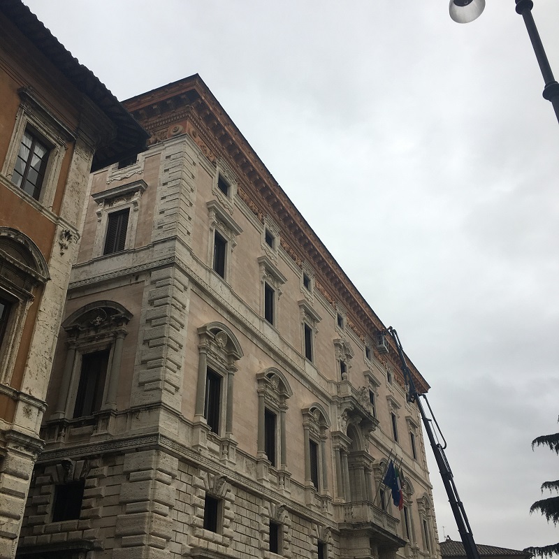 Operai al lavoro per riparare i danni a Palazzo Cesaroni, sede dell’Assemblea regionale dell’Umbria, provocati dal maltempo. Pioggia e vento avevano infatti provocato il distacco di pezzi di cornicione e intonaco dalla sommità della facciata dell’edificio che dà su piazza Italia. Costringendo all’intervento i vigili del fuoco e la polizia municipale, che aveva provveduto a transennare parte del marciapiede antistante lo storico edificio, che tra l’altro è stato interessato recentemente da un importante intervento di restauro.