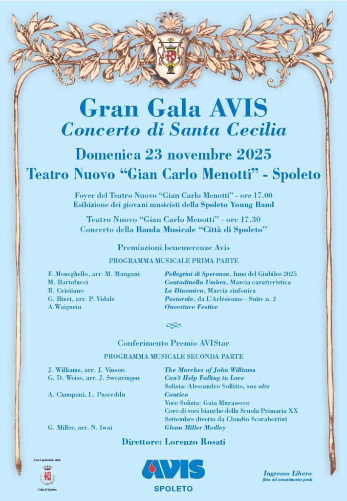 L’AVIS di Spoleto invita la cittadinanza a partecipare al Gran Gala dell’AVIS di Spoleto che si terrà al Teatro Nuovo “Giancarlo Menotti” domenica 23 novembre alle ore 17.00.