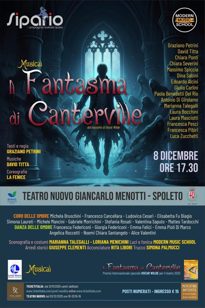Il celebre racconto di Oscar Wilde diventa un musical moderno, graffiante ed emozionante. Debutta l’8 dicembre 2025 alle 17:30 a Spoleto “Il Fantasma di Canterville”, la nuova produzione della Compagnia Teatrale SIPARIO e della Modern Music School, per la regia di Graziano Petrini, autore e attore dalla penna dissacrante e profonda, recentemente insignito del Premio Letterario Internazionale Oscar Wilde.