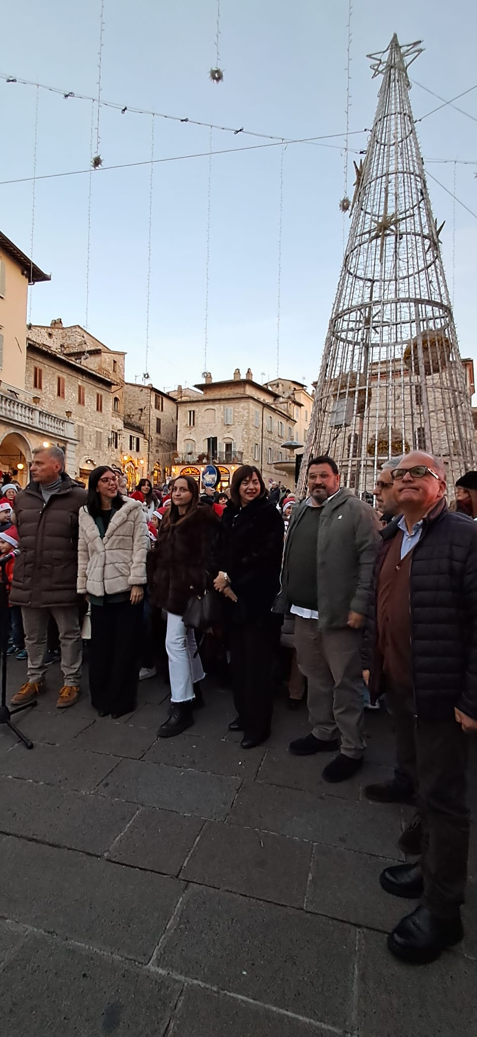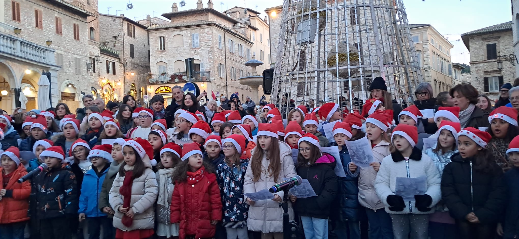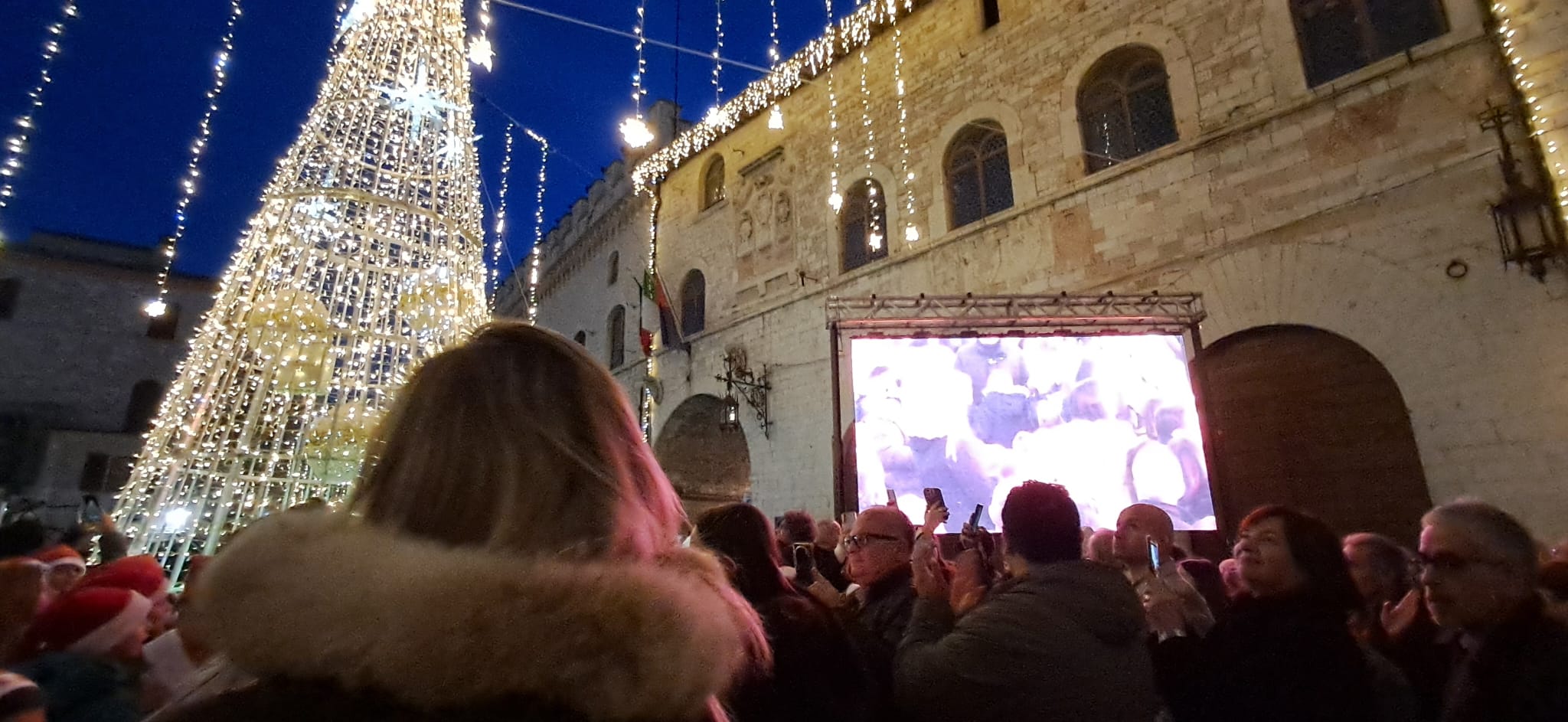 Nel pomeriggio del 6 dicembre in Piazza del Comune anche l’accensione del grande albero di Natale in collegamento su maxischermo con Betlemme, gemellata con Assisi, dove si trova in visita il sindaco Valter Stoppini, insieme a una delegazione comunale. È stato proprio lui a spingere, simbolicamente, il bottone che ha dato il via a un Natale di pace, luce e incontro, dalla città in cui è nato Gesù, insieme al primo cittadino Maher Nicola Canawati, che era stato ad Assisi lo scorso ottobre, in occasione della Marcia per la Pace. L’evento è stato accompagnato da canti natalizi del coro degli alunni del “Convitto Nazionale Principe di Napoli” e poi dalle musiche festose dei “Babbi Natale Marching Band”, che hanno girato per le vie del centro storico.