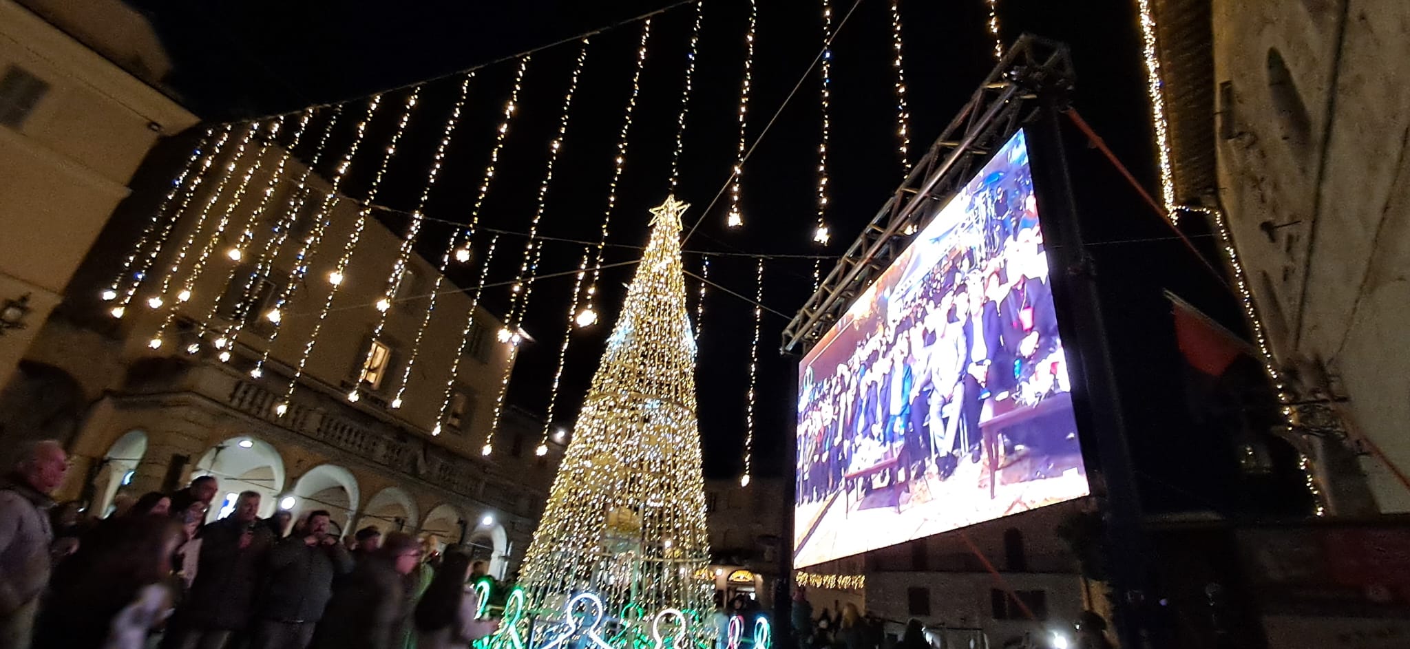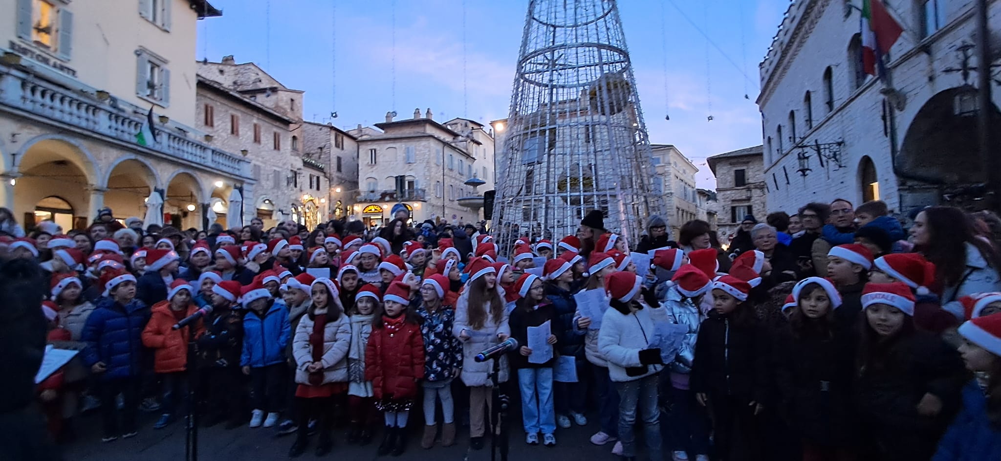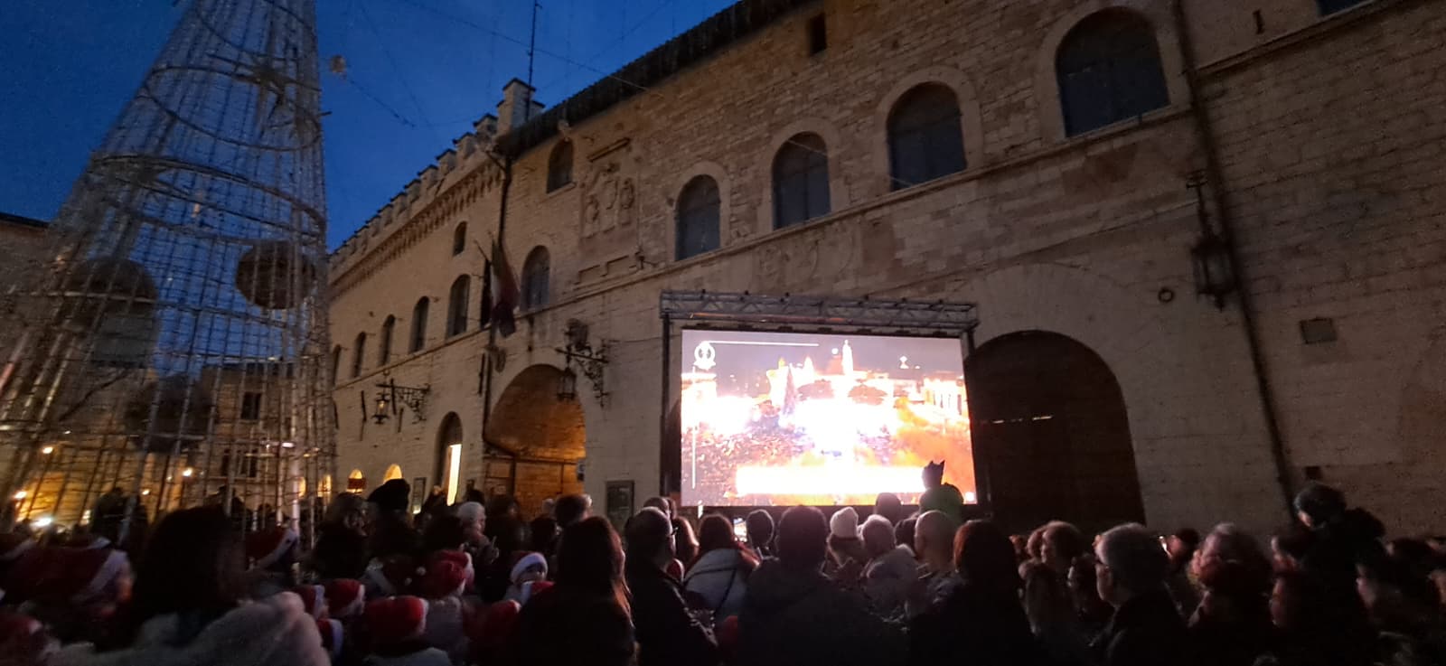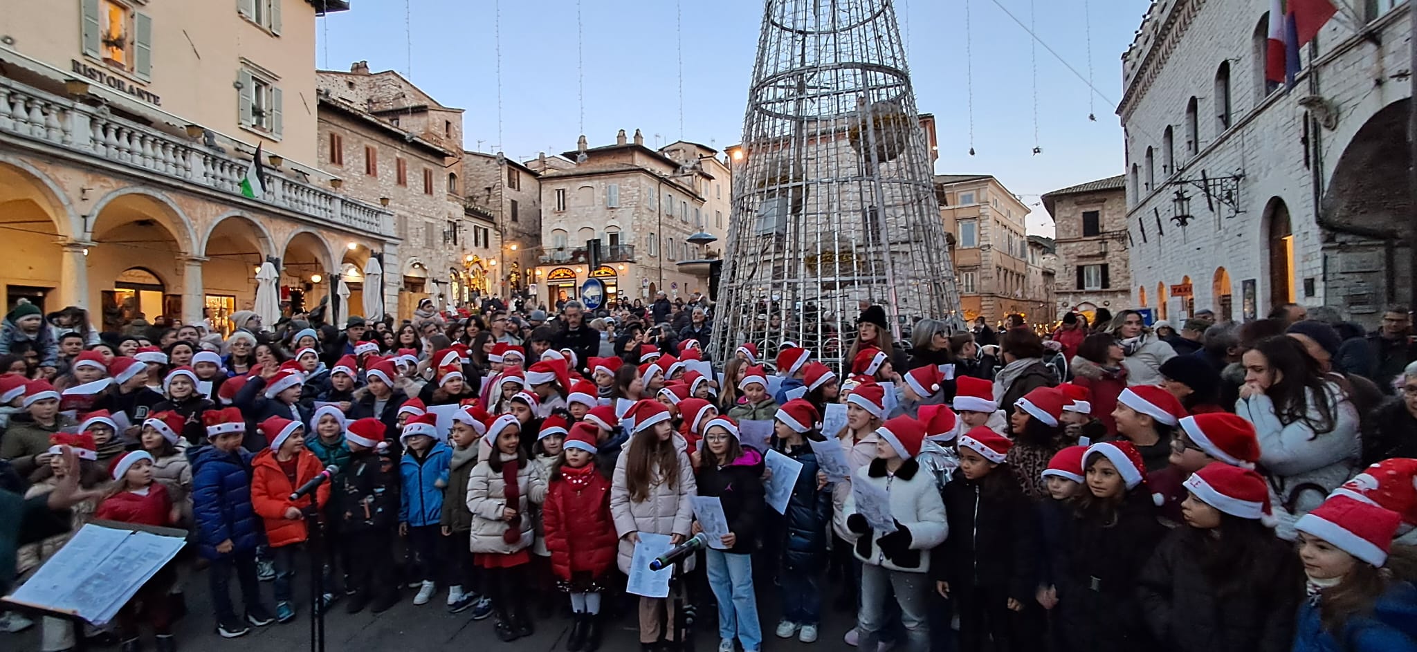 Nel pomeriggio del 6 dicembre in Piazza del Comune anche l’accensione del grande albero di Natale in collegamento su maxischermo con Betlemme, gemellata con Assisi, dove si trova in visita il sindaco Valter Stoppini, insieme a una delegazione comunale. È stato proprio lui a spingere, simbolicamente, il bottone che ha dato il via a un Natale di pace, luce e incontro, dalla città in cui è nato Gesù, insieme al primo cittadino Maher Nicola Canawati, che era stato ad Assisi lo scorso ottobre, in occasione della Marcia per la Pace. L’evento è stato accompagnato da canti natalizi del coro degli alunni del “Convitto Nazionale Principe di Napoli” e poi dalle musiche festose dei “Babbi Natale Marching Band”, che hanno girato per le vie del centro storico.