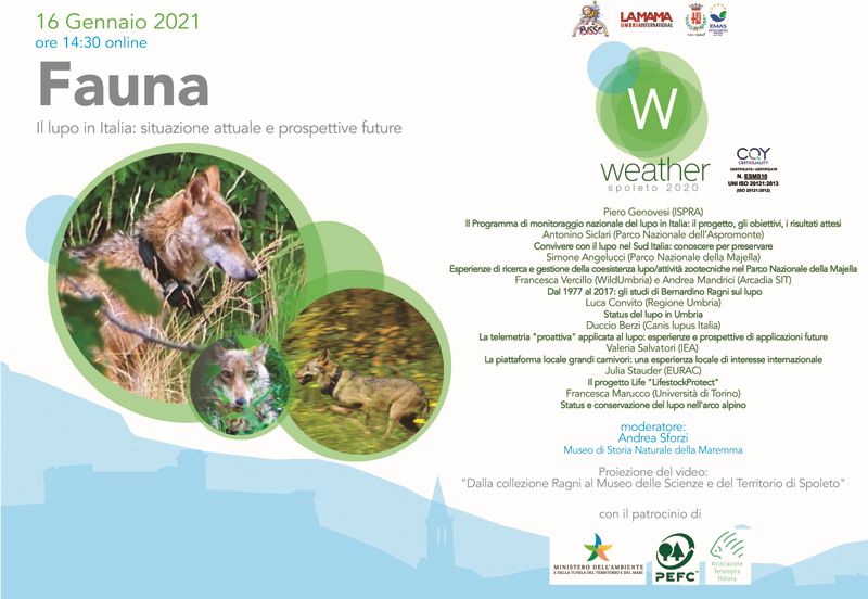 Sabato 16 gennaio 2021 si inizia dalle ore 9 alle ore 13 con attività di didattica ambientale rivolta alle scuole; dalle ore 14.30 alle ore 19, si terrà la diretta sul canale YouTube del Comune di Spoleto (https://bit.ly/2LpWXlW) il convegno nazionale “Il Lupo in Italia: conoscenze attuali e prospettive future” con studiosi di fama internazionale, ricercatori e rappresentanti di diverse istituzioni italiane. Il Comitato scientifico del Convegno è composto da Federica Andreini, Lolita Bizzarri, Francesca Vercillo, Andrea Sforzi, Cristiano Spilinga. L’Ente organizzatore èil Comune di Spoleto in collaborazione con il Museo di Storia Naturale della Maremma con il patrocinio del Ministero dell’Ambiente, PEFC e dell’Associazione Teriologica Italiana. 14.30 Saluti delle autorità (Moderatore: Andrea Sforzi, Museo di Storia Naturale della Maremma), 14.50 Piero Genovesi (ISPRA) Il Programma di monitoraggio nazionale del lupo in Italia: il progetto, gli obiettivi, i risultati attesi, 15.10 Antonino Siclari (Parco Nazionale dell’Aspromonte) Convivere con il lupo nel Sud Italia: conoscere per preservare, 15.30 Simone Angelucci (Parco Nazionale della Majella) Esperienze di ricerca e gestione della coesistenza lupo/attività zootecniche nel Parco Nazionale della Majella, 15.50 Francesca Vercillo (WildUmbria) e Andrea Mandrici (Arcadia SIT) Dal 1977 al 2017: gli studi di Bernardino Ragni sul lupo, 16.10 Proiezione del video: “”Dalla collezione Ragni al Museo delle Scienze e del Territorio di Spoleto”, 16.15 Luca Convito (Regione Umbria) Status del lupo in Umbria, 16.35 Duccio Berzi (Canis lupus Italia) La telemetria “proattiva” applicata al lupo: esperienze e prospettive di applicazioni future, 16.55 Valeria Salvadori (IEA), La piattaforma locale grandi carnivori: una esperienza locale di interesse internazionale, 17.15 Julia Stauder (EURAC) Il progetto Life “LifestockProtect”, 17.35 Francesca Marucco (Università di Torino) Status e conservazione del lupo nell’arco alpino, 17.55 l’attore Claudio Trionfi leggerà alcuni brani tratti dalle pubblicazioni di Bernardino Ragni sul lupo e chiusura dei lavori.