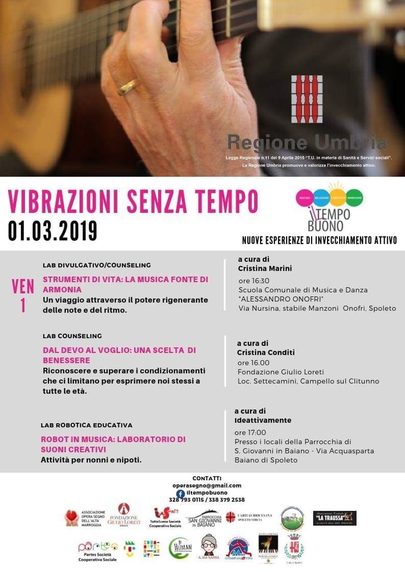 Inserito tra gli eventi de “Il Tempo Buono”, iniziativa dell’Associazione Opera Segno dell’Alta Marroggia realizzata insieme ad altre realtà del terzo settore, per scoprire in comunità il potenziale dell’invecchiamento attivo, il Comune di Spoleto darà il proprio contributo al progetto con un appuntamento alla Scuola Comunale di Musica e Danza “Alessandro Onofri” che si svolgerà Venerdì 1 marzo, alle ore 16,30 dal titolo: “Strumenti di vita: la musica fonte di armonia. Un viaggio attraverso il potere rigenerante delle note e del ritmo”.