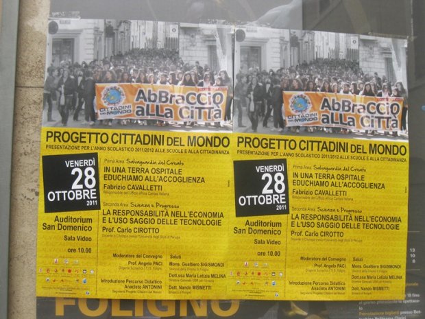 È stata la Sala Video dell’Auditorium San Domenico di Foligno ad ospitare la presentazione alle scuole e alla cittadinanza di “Cittadini del Mondo” per l’anno scolastico 2011/2012. Giunto alla sua sesta edizione, il Progetto, promosso dalla Diocesi di Foligno, è realizzato in collaborazione con la Regione Umbria, l’Ufficio Scolastico Regionale, la Provincia di Perugia, i Comuni di Foligno e di Spello, la Fondazione Migrantes della Conferenza Episcopale Italiana, L’Agorà del Mediterraneo, il Museo interreligioso di Bertinoro e il Progetto Lettura ed ha come obiettivo l’instaurazione sul territorio di una collaborazione tra le diverse agenzie educative, in particolar modo scuola, Diocesi e Comune, realizzando un percorso educativo che aiuti i giovani a vivere con passione la vita attraverso scelte di pace, di giustizia, di solidarietà, di verità e di servizio nei confronti della persona umana e del bene comune. Nell’anno scolastico 2011/2012 il Progetto tenderà, in particolare, a far raggiungere agli studenti il saper riflettere insieme, il promuovere la cultura della solidarietà e dell’accoglienza, il riappropriarsi dei valori del volontariato e della partecipazione, il formarsi attraverso gli stages anche extra scuola, lo sperimentare una forma di cittadinanza attiva e il conoscere e confrontarsi con esperti sulle nuove frontiere della scienza.