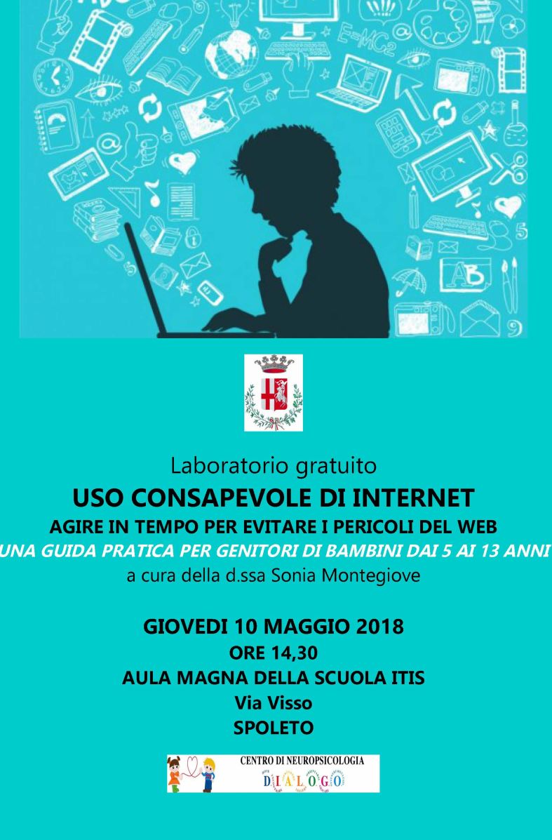 Nel quadro delle iniziative promosse dal Tavolo Interistituzionale dell’Adolescenza, coordinato dal Comune di Spoleto, giovedì 10 maggio 2018 dalle ore 14,30 presso l’aula magna dell’ITIS in via Visso si terrà un laboratorio formativo, dal titolo “Uso consapevole di internet: agire in tempo per evitare i pericoli del web. Una guida pratica per genitori di bambini dai 5 ai 13 anni”.