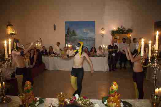 Lo chef Roberto Brinci, coadiuvato da Marcella Mazzoli, Lorenzo Gasparrini e Federica Costarelli, ha presentato un accattivante menù con Pasticci di pavone e testa di vitello e minestra di polpe di fagiano secondo le ricette di Cervio e Stefani. Gli intermezzi musicali sono stati eseguiti dall’Ensamble di musica rinascimentale Orientis Partibus di Assisi del maestro Vladimiro Vagnetti insieme ai cantori Emanuele Fagotti ed Eleonora Capuozzo. Le coreografie sono state interpretate da Elena Shannon, Giada e Michael Donati ed Elisa Cingolani del gruppo “Le Sirene del Nilo”. Cristina Ceccucci ha acconciato e truccato gli attori, mentre Paola Majuri ha disegnato i costumi.