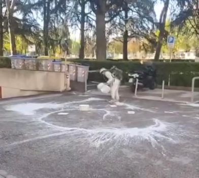 Questa volta è stata filmata l’imbrattatrice di Ponte San Giovanni, mentre con la sua tuta e il suo bizzarro copricapo sporca di vernice bianca la strada. Come ha fatto altre volte, in altri punti della popolosa frazione peruina.