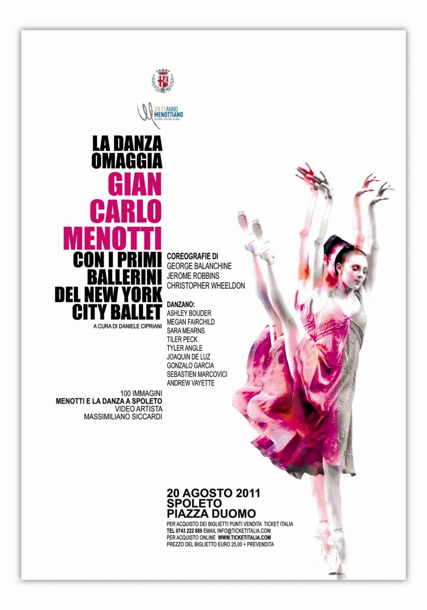 Nell’ambito delle iniziative per l’anno Menottiano, con cui la città di Spoleto vuole celebrare, a cento anni dalla nascita, l’ideatore del Festival dei 2 Mondi, la Daniele Cipriani Entrertainment ha creato uno spettacolo-evento di danza, dedicato alla figura del Maestro Gian Carlo Menotti e al suo genio di animatore culturale.Interpreti in scena in Piazza Duomo, sabato 20 agosto alle 21.15, saranno i primi ballerini del New York City Ballet: Ashley Bouder, Megan Fairchild, Sara Mearns, Tiler Peck, Tyler Angle, Joaquin De Luz, Gonzalo Garcia, Sebastien Marcovici e Andrew Veyette. Alcune delle coreografie di George Balanchine, presentate in occasione del suo debutto a Spoleto nel 1965, verranno riproposte all’interno del programma, come Tarantella, Agon e Stars and Stripes. La partecipazione all’evento dei primi ballerini del New York City Ballet, una delle più celebri compagnie di danza al mondo, rappresenterà il vero punto di forza della serata. La compagnia, fondata dal genio di George Balanchine, ripropone tutt’oggi le sue creazioni riconosciute universalmente come dei capolavori senza tempo. La serata celebrerà non solo il Menotti “promotore dell'arte e del Festival dei due Mondi”, ma anche il Menotti “compositore di musiche per balletto”, ancora oggi eseguite in tutto il mondo. Il pubblico, al suo ingresso, verrà accolto dalle composizioni più belle, come quelle per i balletti Sebastian ed Errand into the Maze create per Martha Graham.