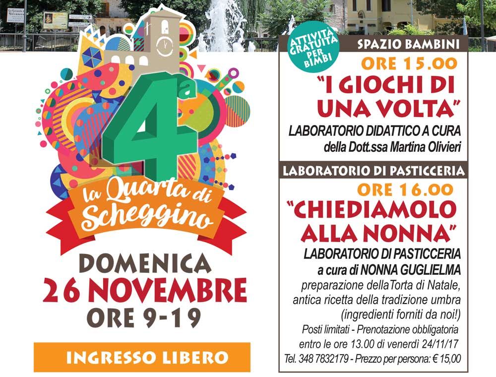 La Quarta di Scheggino è un’iniziativa organizzata dalla Pro loco con la collaborazione degli esercizi commerciali del territorio ed il patrocinio del Comune di Scheggino. Avviata a marzo, la mostra mercato, che si tiene la quarta domenica di ogni mese, sta riscuotendo sempre più successo, sia tra i visitatori che tra gli operatori ed artigiani che espongono prodotti tipici di eccellenza del territorio umbro e artigianato di qualità. Ogni mese, poi, vengono proposte varie iniziative collaterali, come laboratori per adulti e piccini, animazioni, musica, spettacoli. Un’iniziativa che nel giro di poco tempo, insomma, si è andata consolidando, diventando uno dei mercatini fissi che caratterizzano la regione. L’appuntamento di dicembre, vista la concomitanza con le festività natalizie, verrà anticipato a domenica 17 dicembre e proporrà numerose sorprese. Ulteriori informazioni su www.laquartadischeggino.it