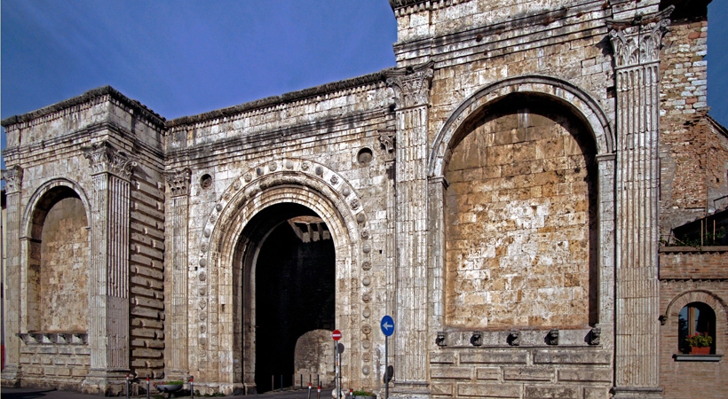 La Porta San Pietro o Arco di Duccio è inserita nella cita muraria cittadina del XIII-XIV secolo, alla fine di Corso Cavour. La sua facciata esterna, in travertino, fu realizzata da Agostino di Duccio e da Polidoro di Stefano secondo un disegno rinascimentale che rievoca, negli elementi decorativi e nella struttura, la composizione architettonica dell’Arco Etrusco. Fu poi restaurata intorno alla metà del 700 da Francesco degli Ubaldi.