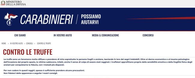 Il sito internet dell’Arma dei Carabinieri – da sempre impegnata nel contrasto al fenomeno delle truffe a danno dei soggetti più vulnerabili – ospita una sezione dedicata ai consigli utili a prevenirle e riconoscerle, raggiungibile al link: https://www.carabinieri.it/in-vostro-aiuto/consigli/contro-le-truffe