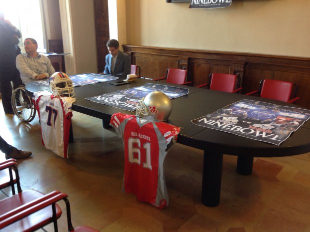 Spoleto si appresta ad ospitare per la prima volta nella sua storia un match federale di Football Americano. E non un match qualunque, ma nientemeno che il “Nine Bowl”, il Super Bowl del Football a giocato a nove. A contendersi il titolo, domani alle 21 presso lo stadio comunale, saranno le Aquile Ferrara, campioni della North Conference, e i Red Jackets Lunigiana, vincitoridella South Conference. Le Aquile sono arrivate alla finale dopo un cammino immacolato, vincendo tutte le partite disputate e mettendo inmostra un assetto di squadra molto solido ed equilibrato. I RedJackets, dopo la sconfitta iniziale contro gli Storms Pisa, sono andati in crescendo e si sono fatti apprezzare per il gioco spettacolare. Due grandi squadre, con grande carattere e tanta voglia di vincere. L'evento è stato presentato nella sala dello Spagna, nel palazzo comunale di Spoleto.