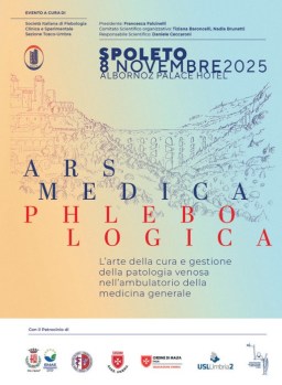 Sabato 8 Novembre 2025 La Società Italiana di Flebologia Clinica e Sperimentale Sezione Tosco-Umbra terrà a Spoleto alle ore 9,00 il convegno “ARS PHLEBOLOGICA” presso L’Albornoz Palace Hotel. All’incontro saranno invitati i medici di Medicina Generale dell’Usl Umbria 2, per discutere insieme a specialisti angiologi e chirurghi vascolari riguardo la formazione di una rete di assistenza globale sul territorio ai pazienti affetti da malattia venosa cronica invalidante.