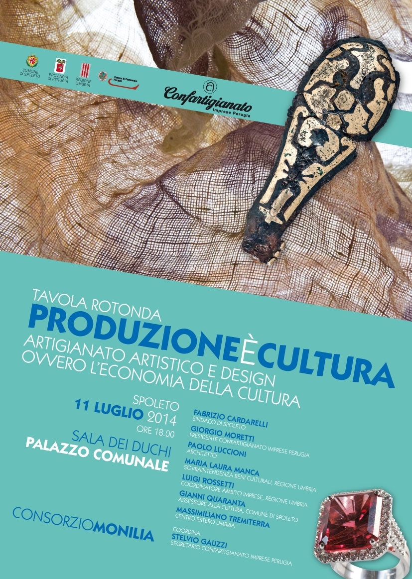 Una tavola rotonda dal titolo “Produzione è cultura – artigianato artistico e design ovvero l’economia della cultura” è quella che si terrà venerdì 11 luglio (ore 18) alla Sala di Duchi di Palazzo Comunale. L’incontro è stato organizzato da Confartigianato e ConsorzioMonilia con il patrocinio della Regione Umbria, Provincia di Perugia, Comune di Spoleto e Camera di Commercio di Perugia.