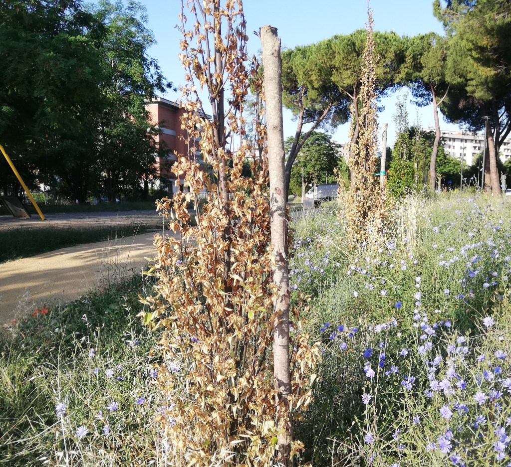 Alberi lasciati crescere (o morire). Senz’acqua o, al contrario, in una situazione tale da sviluppare una folta chioma che finisce per invadere marciapiedi e strade.