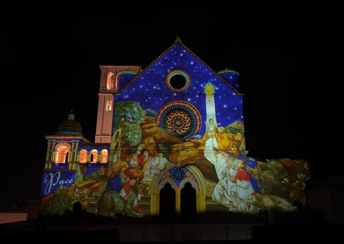 A ispirare i creativi il tema della pace e artisti come Chagall, Magritte, Klimt, Köder, Picasso, che testimoniano la pace attraverso elementi tratti da alcune delle loro creazioni più famose, reinterpretate e adattate alle architetture delle facciate. Cuore del progetto è Piazza del Comune, dove la tematica “Pace sulla Terra” viene interpretata attraverso una selezione di alcune opere di Banksy, protagoniste della mostra “Peace on Earth”, visitabile alla Rocca Maggiore fino all’11 gennaio 2026. La videoproiezione a San Francesco è realizzata da EnelX grazie al sostegno del Comune di Assisi.