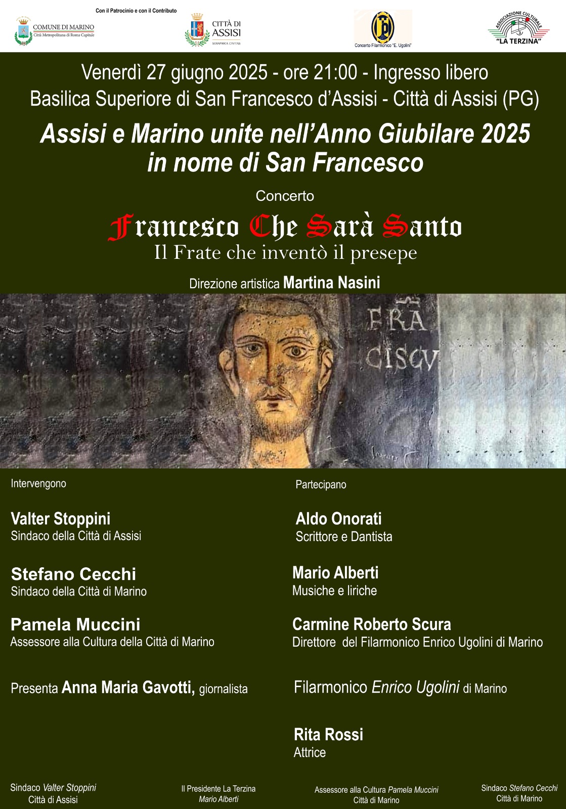 “È un onore per la nostra città contribuire alle celebrazioni del Giubileo 2025 proprio ad Assisi con un evento di così alto valore artistico e spirituale – ha sottolineato il Sindaco di Marino Stefano Cecchi – Le nostre città legate dal 2011 da un indissolubile patto d’amicizia, e accomunate dal forte rapporto di Jacopa de’ Settesoli con San Francesco, si ritrovano oggi ancora più vicine grazie alla musica del nostro concittadino, il M° Mario Alberti e al Filarmonico Enrico Ugolini che rendono orgogliosa tutta la comunità.”